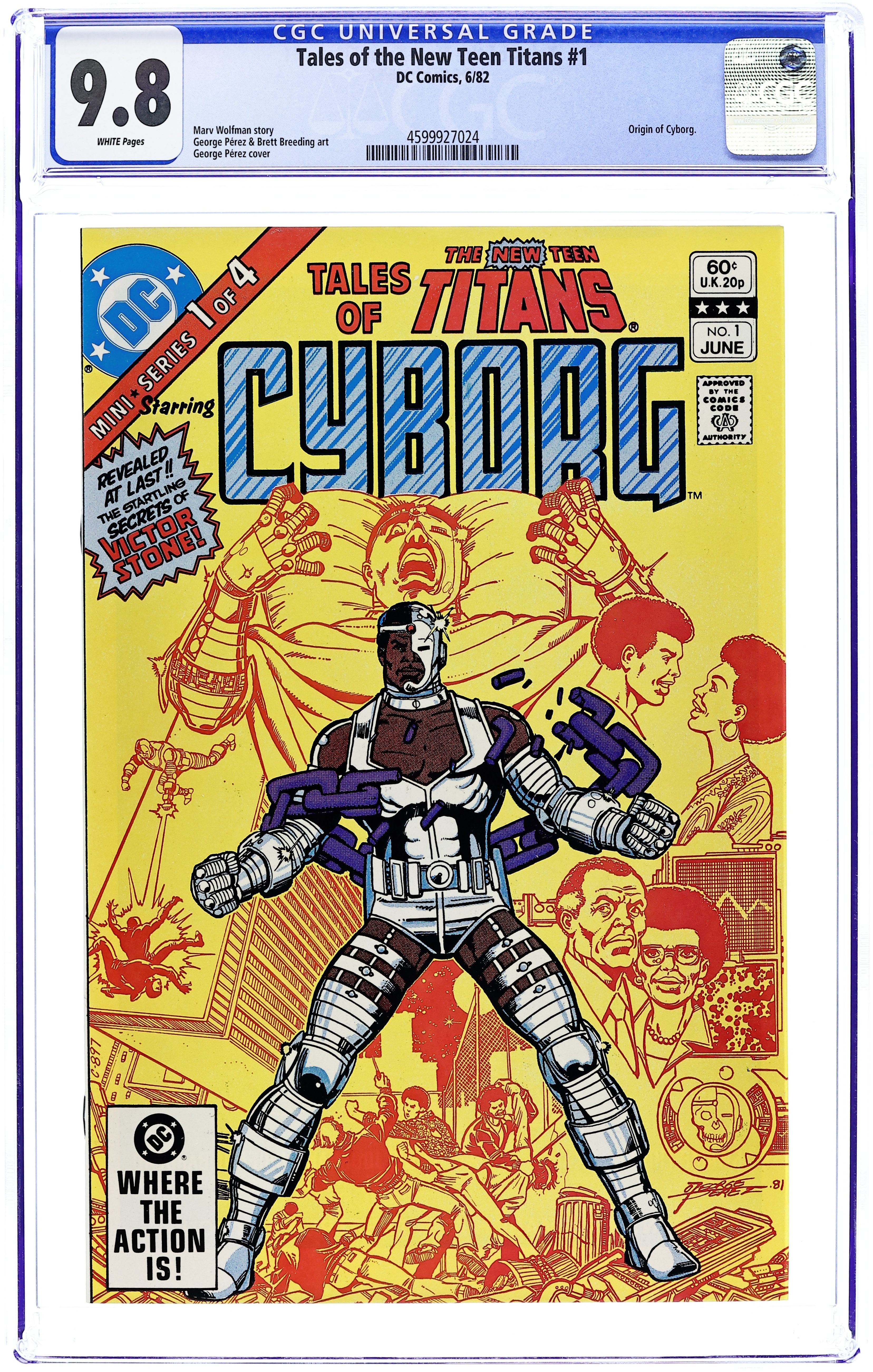 Direct Edition. Script by Marv Wolfman, pencils by George Perez, embellishes by Brett Breeding. Cyborg pin-up by Perez. Cover by Perez. Victor Stone tells the other Titans about his past, relating his animosity towards his father, running with the wrong crowd, and the events that turned him into "Cyborg." 25-page tale. Appearances by Robin, Wonder Girl, Kid Flash, Starfire, Changeling, Raven. Cover price $0.60.