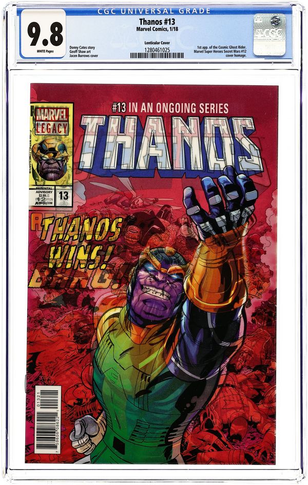 Lentcular Variant Cover. Thanos Wins: Part 1 - Written by Donny Cates. Art by Geoff Shaw. Cover by Jacen BurrowsAsk the most powerful beings in the Marvel Universe how they fear the universe will end, and in their most honest moment, they will answer with two words… THANOS WINS. Now… see what happens when he does.PLUS: Includes 3 bonus MARVEL PRIMER PAGES! Parental Advisory Cover price $3.99.