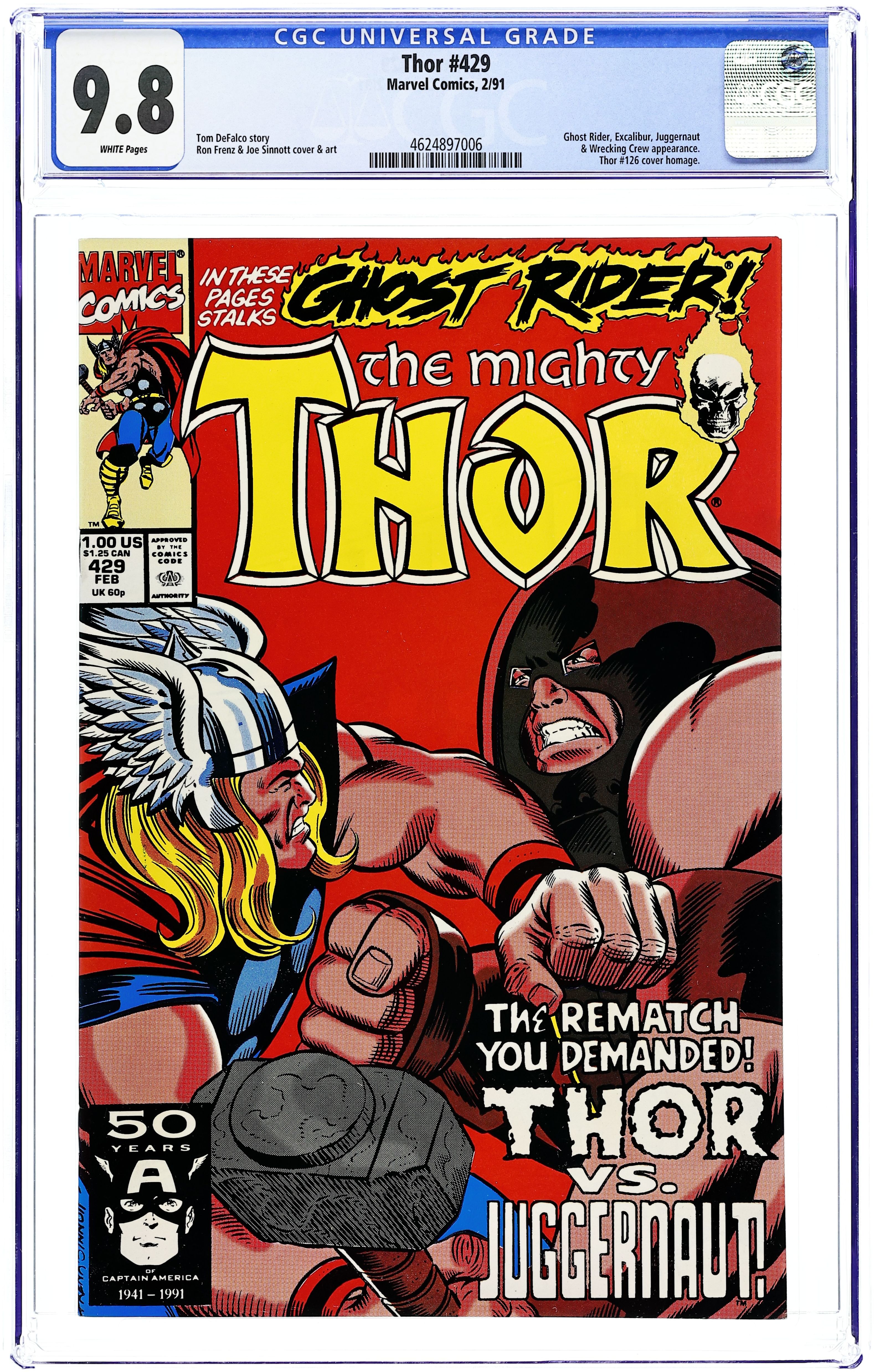 Cover pencils by Ron Frenz, inks by Joe Sinnott. "This World Is Mine!", script by Tom DeFalco (plot and script) and Ron Frenz (plot), pencils by Ron Frenz (layouts) and Joe Sinnott (finishes), inks by Joe Sinnott (finishes); On an alien planet, Thor and Excalibur free it's people from tyrants Juggernaut and Prince Zalaski; On Earth the Wrecking Crew, in attempting to free from prison one of their own, clashes with Code Blue and Ghost Rider. Bullpen Bulletins. 36 pgs., full color. $1.00. Cover price $1.00.