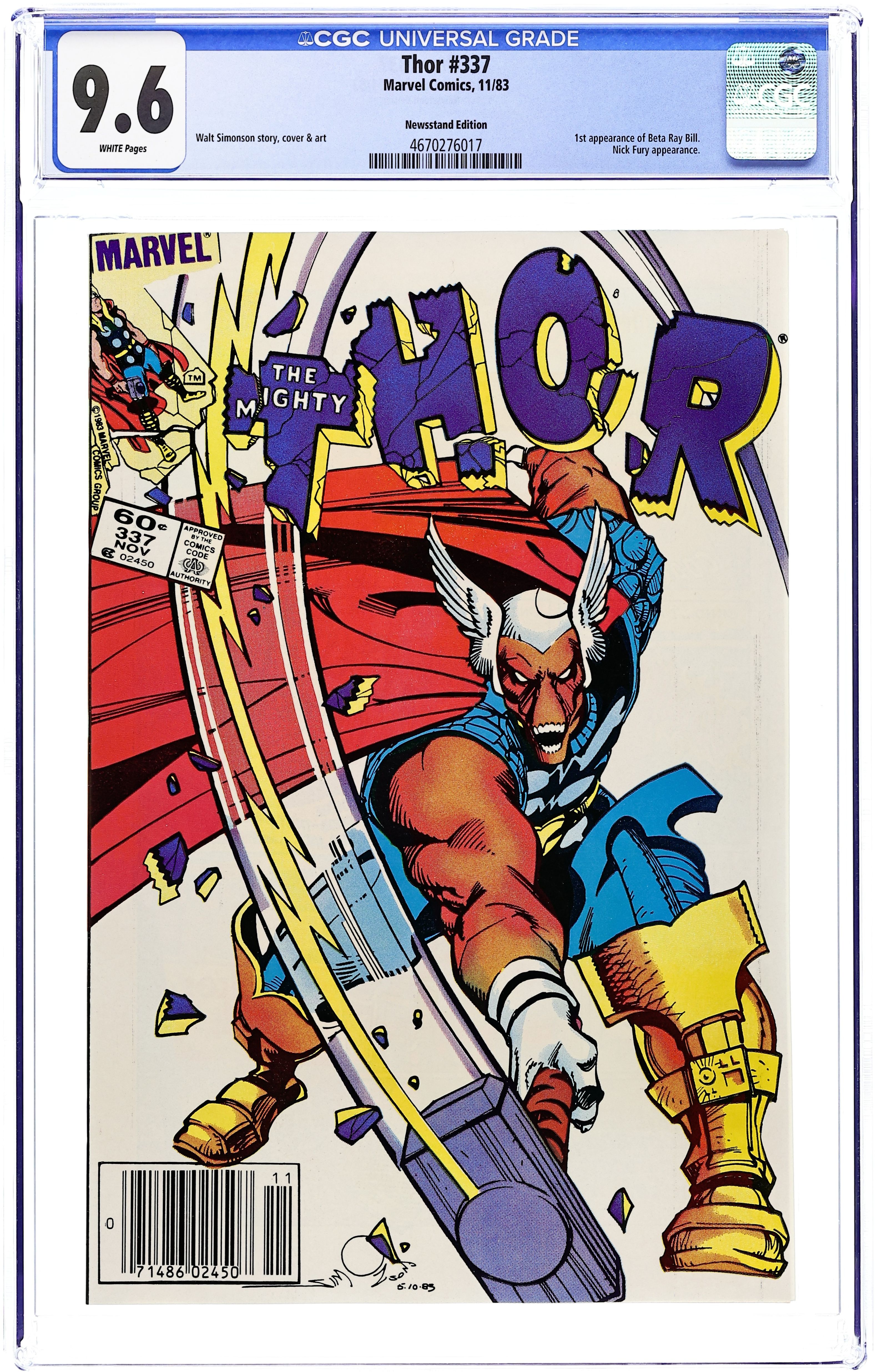 Newsstand Edition. Cover pencils by Ron Frenz, inks by Al Milgrom. Metallic purple cover. Intro new Thor (Eric Masterson) in "Whosoever Holds This Hammer," script by Tom DeFalco and Ron Frenz (plot), pencils by Ron Frenz (layouts), inks by Al Milgrom (finished art); Eric Masterson must begin to learn how to handle the new Thor powers without the guidance of the old Thor; Ulik battles Thor and Code Blue. Bullpen Bulletins. Ron Frenz writes about the retirement of Joe Sinnott. 52 pgs., full color. $1.50. Cover price $1.00.