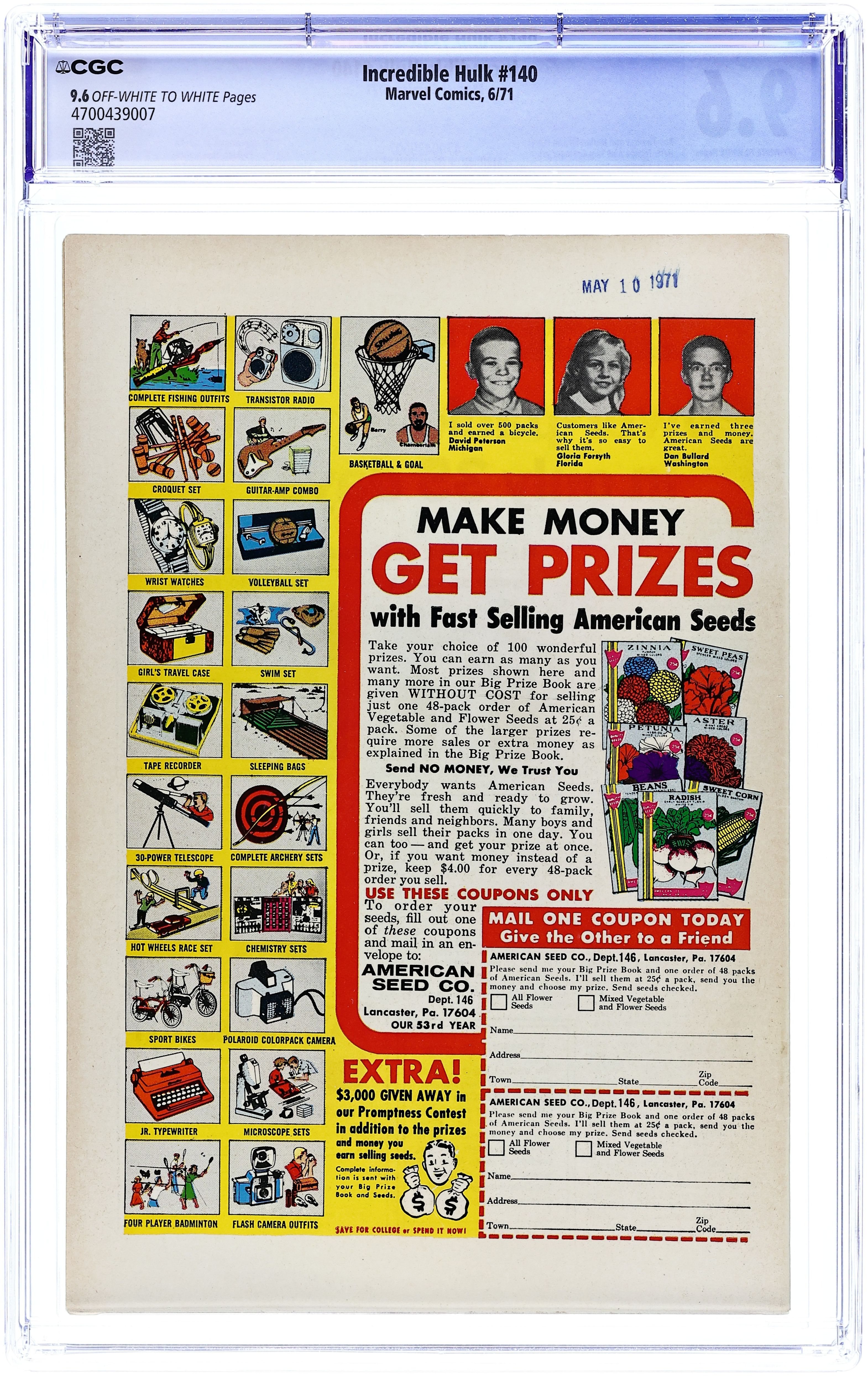 Ends Apr 15 7:09 PM CST Bid History no bids Minimum Bid $1 Your Secret Max Bid If you'd like to bid, please log in or register. Cover art by Herb Trimpe. The Hulk's Last Fight!, script by Roy Thomas, art by Herb Trimpe; Despairing after he turns into his human alter ego and finds that the Hulk has destroyed a train for no apparent reason, Bruce Banner finds a newspaper headline that asks him to come to New York as Mr. Fantastic believes that he has discovered a way to do away with the Hulk for good; Riding the rails to the Big Apple, Bruce tries to jot some notes of his own regarding Reed's process and secures them to his waist as he finds himself transforming once again into the Hulk to face down some pesky hoboes; By the time he makes it to the Baxter Building, our hero is once again in the form of Bruce Banner but an irate security guard makes his metabolism race and he changes into his monstrous alter ego; During Hulk's battle with the F.F., Sue notices as the pouch with Bruce's notes falls from the Hulk's waist and the Thing is called on to keep the jade giant occupied while Reed uses the new information to modify his weapon design in trying to banish the Hulk for good. 36 pgs. $0.15. Cover price $0.15.