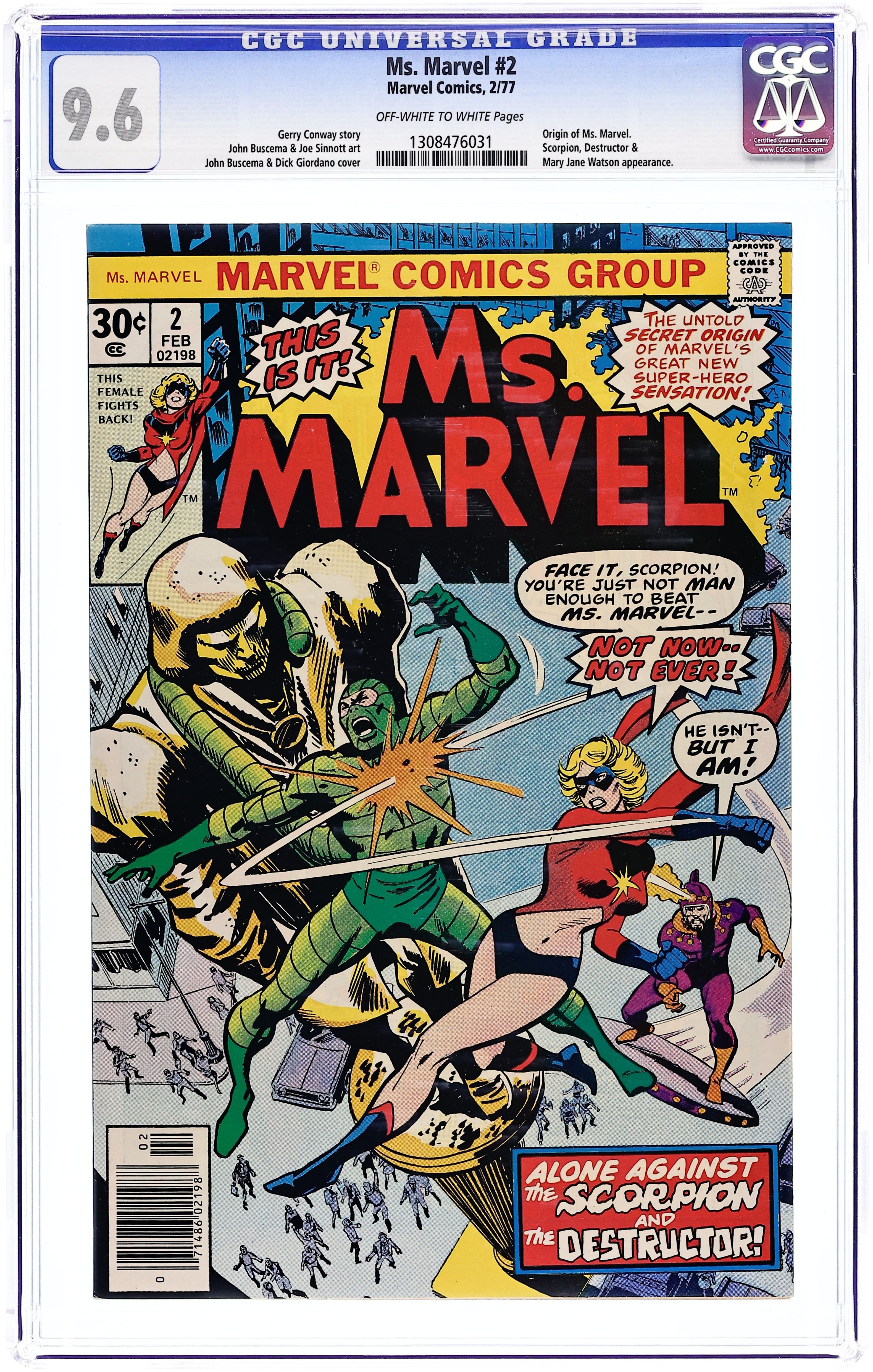 Cover pencils by John Buscema, inks by Dick Giordano. Enigma of Fear!, script by Gerry Conway, pencils by John Buscema (breakdowns) and Joe Sinnott (finished art), inks by Joe Sinnott; Kerwin becomes the Destructor and promises to take down Ms. Marvel for AIM; Scorpion escapes from AIM's clutches; Carol, freaked out by her blackouts and lack of memory, visits her friend Barnett who discovers she is Ms. Marvel during a hypnotic session but fails to tell her; Ms. Marvel takes on Scorpion and Destructor. Ink Stains on Virgin Paper article by David Anthony Kraft; Origin of Ms. Marvel revealed; Mary Jane cameo. Ad for Ricochet Racers featuring Spider-Man and Captain America. 36 pgs. $0.30. Cover price $0.30.