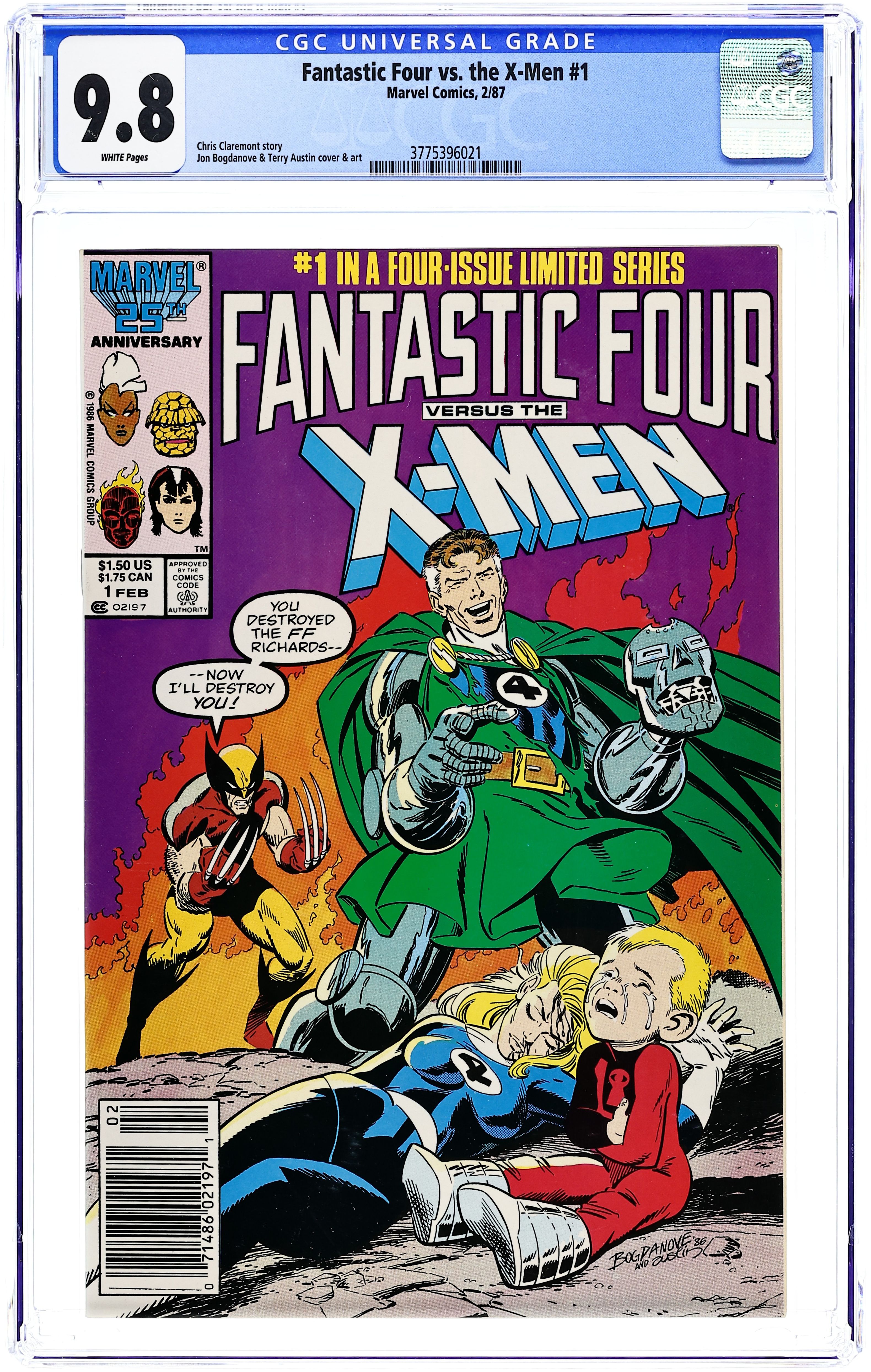 Newsstand Edition. "Truths and Consequences!" Story by Chris Claremont. Art by Jon Bogdanove and Terry Austin. Reed Richard's inability, or refusal, depending on your point of view, to help Kitty Pryde causes a skirmish between the Fantastic Four and the Uncanny X-Men. During the course of the fight, a now powerless Storm (see Uncanny X-Men #185) is badly injured. When the teams part on less than good terms, an ominous message arrives. Victor Von Doom offers his aid in curing the young mutant. Will the X-Men do the unthinkable and deal with the devil? Meanwhile, what secret, now revealed, could possibly tear apart the Fantastic Four? Cover price $1.50.