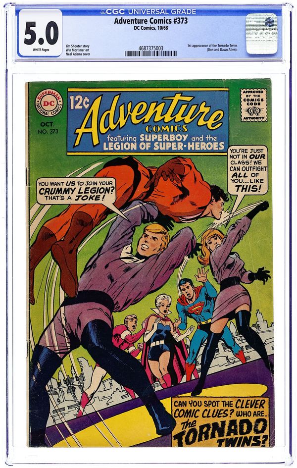 Cover art by Neal Adams. Intro of the Tornado Twins in The Tornado Twins!--Tales of the Legion of Super-Heroes, script by Jim Shooter, pencils by Jim Shooter (layouts only) and Win Mortimer, inks by Win Mortimer; The Tornado Twins use their super-speed powers to upstage the Legion, but it was only a publicity stunt for Flash Day. 36 Pages, Full Color. Cover price $0.12.
