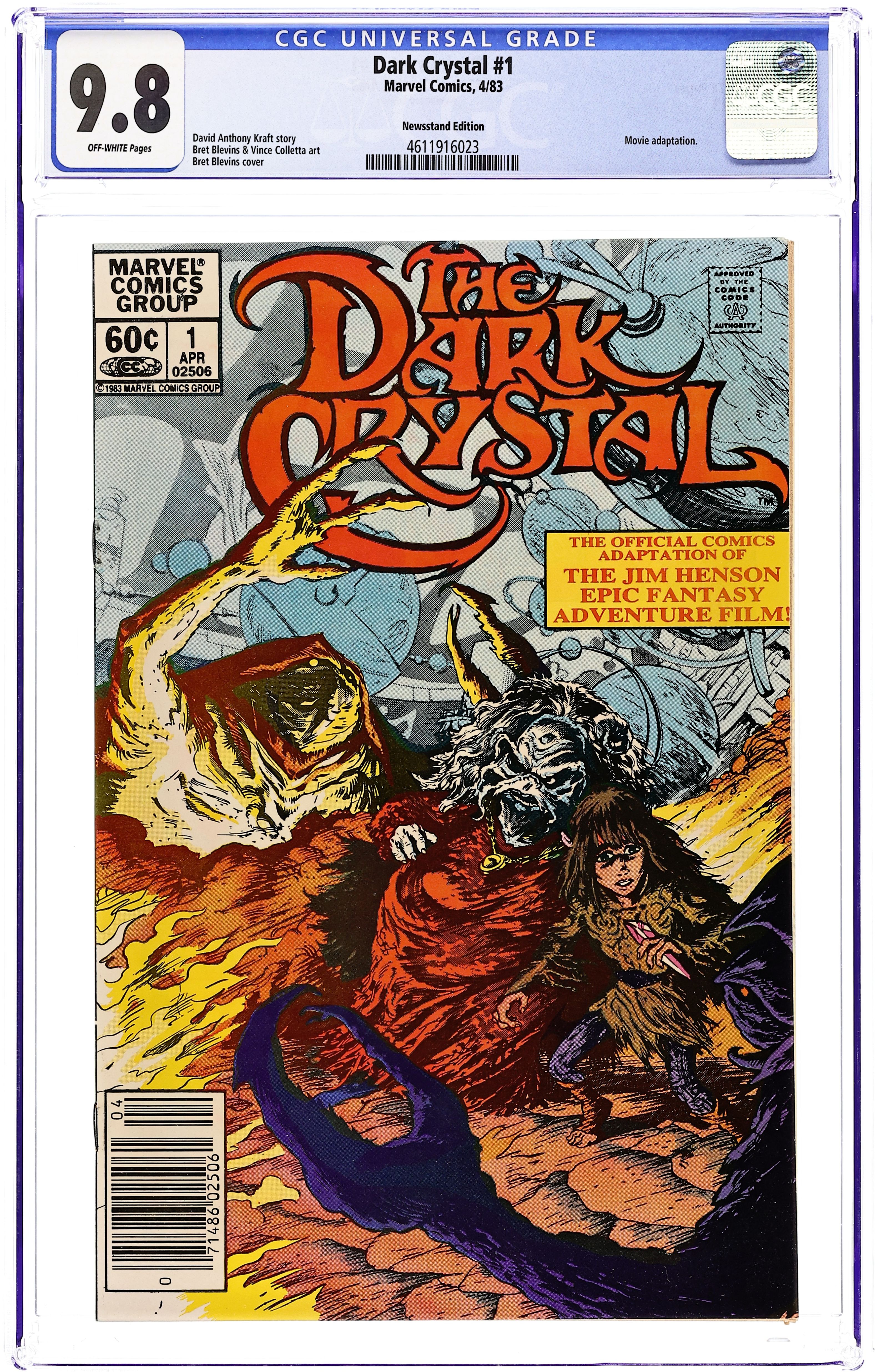 Newsstand Edition. "The Dark Crystal: Part 1 of 2!" Adapted by David Anthony Kraft. Art by Bret Blevins and Vince Colletta. This is the official comics adaptation of the Jim Henson epic fantasy adventure film! 32 pages, FC. Cover price $0.60.