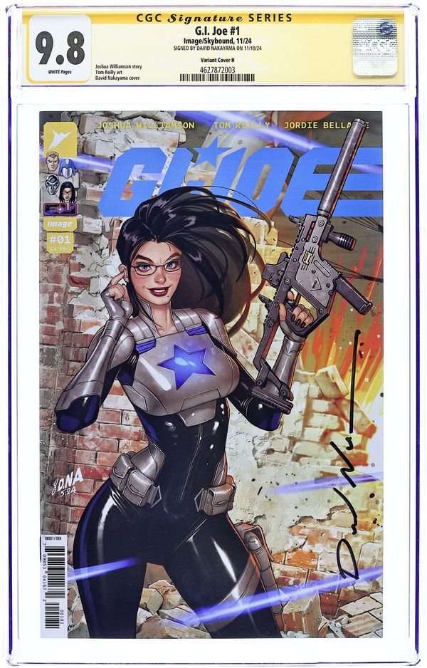 Limited 1 for 10 Retailer Incentive Variant Cover. Written by Joshua Williamson. Art by Tom Reilly, Jordie Bellaire. Cover by David Nakayama. SERIES PREMIERE THE BIGGEST COMIC BOOK LAUNCH OF THE DECADE! Conrad Hauser, Codename DUKE, has assembled a special force known as G.I. Joe to battle the rising power of the mysterious COBRA in the aftermath of the Autobots and Decepticons' arrival on Earth. But the enigmatic Cobra Commander has unleashed the power of Energon like never before! Featuring many familiar faces and the first appearance of an ALL NEW character, this is the comic that will change everything you think you know about G.I. Joe…and that's only half the surprises in store from the chart-topping Energon Universe dream team of JOSHUA WILLIAMSON and TOM REILLY! 36 pages, full color. Rated T Cover price $4.99.