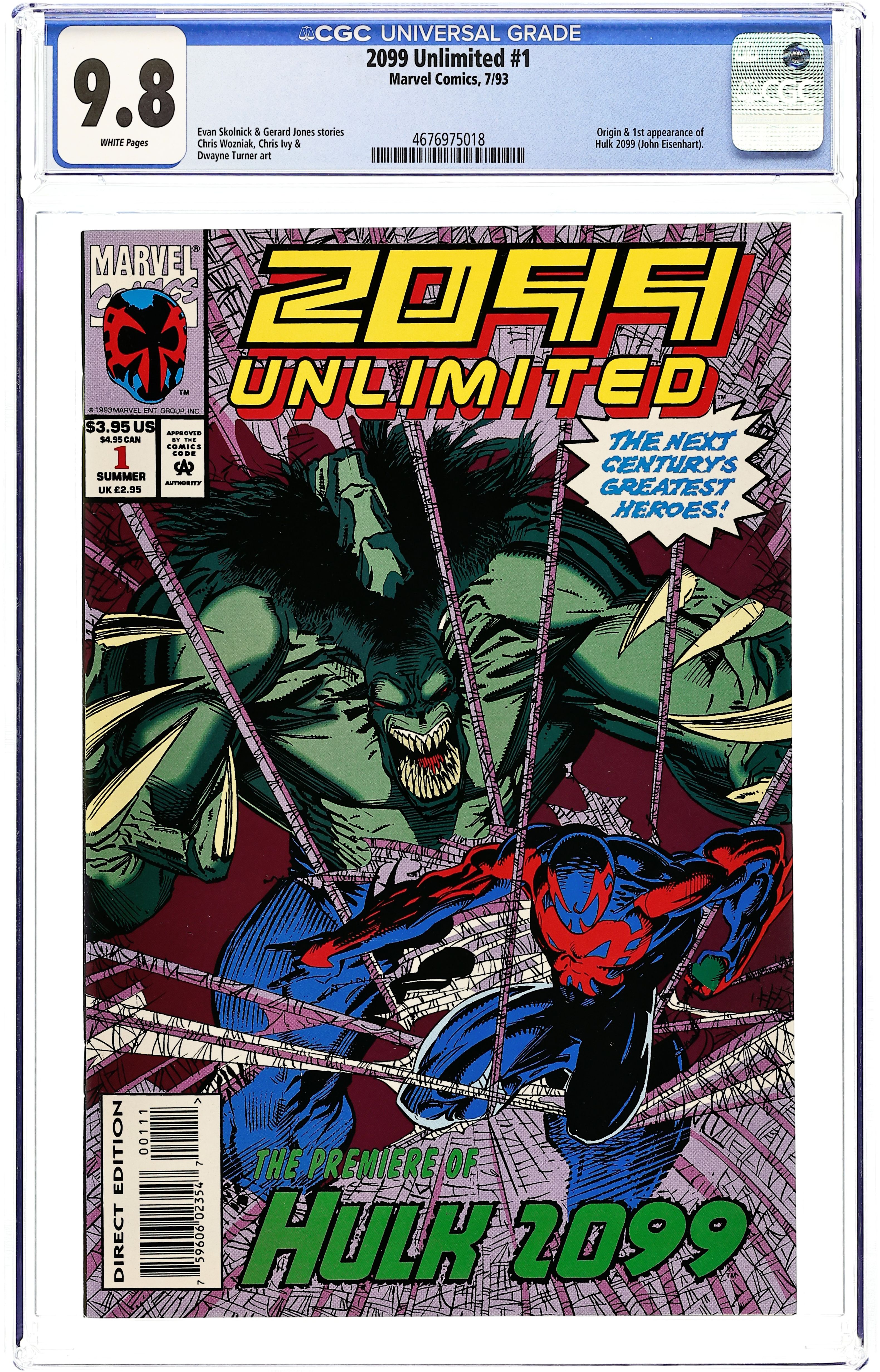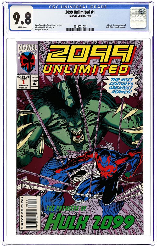 Direct Edition. Cover by Chris Wozniak. 1st app of Hulk 2099 in "Nothing Ever Changes," script by Evan Skolnik, pencils by Chris Wozniak, inks by Chris Ivy; Mutagen is planning on eliminating Homo-inferior; as he calls normal humans; for starters he chooses the hospital one of Spider-Mans friends is in; It is a long hard battle but Spidey is victorious in the end, though Mutagen does get away. Untitled story, script by Gerard Jones, art by Dwayne Turner; Hulk comes out of a six day anger binge to find that his current project at work has been reassigned due to his absence; While researching his next job he comes across evidence that leads him to discover a contract on Naomi. 68 pgs., full color. $3.95. Cover price $3.95.