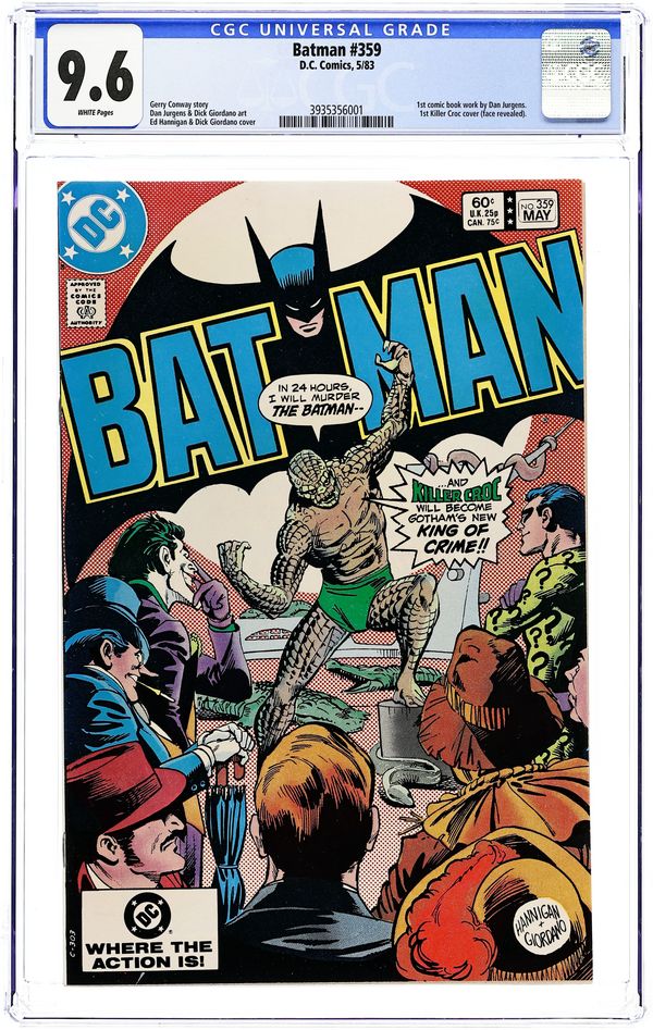 Direct Edition. Cover pencils by Ed Hannigan, inks by Dick Giordano. Jason Todd becomes a continuing character in "Hunt" starring Batman, Dick Grayson, Jason Todd, James Gordon, Vicki Vale, Alfred Pennyworth, Waldo Flynn, Trina Todd, Joe Todd, and Killer Croc, script by Gerry Conway, pencils by Dan Jurgens, inks by Dick Giordano; Featuring the origin of Killer Croc!; Batman searches for the whereabouts of Killer Croc while Croc himself breaks into Gotham City Jail to take care of the last obstacle in his path toward ruling the Gotham Underground. 1st comic book work by Dan Jurgens. 36 Pages, Full Color. Cover price $0.60.