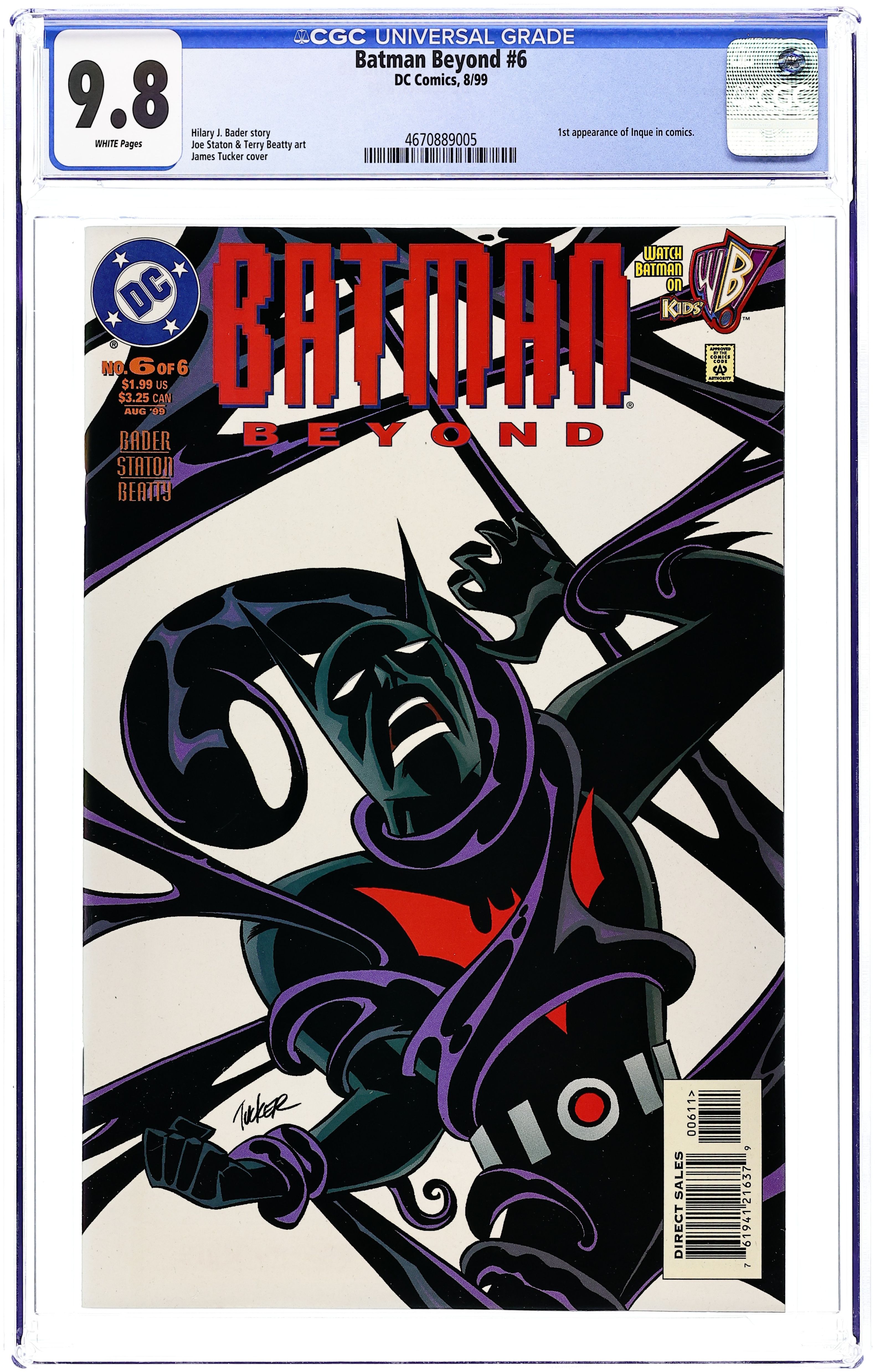 WRITTEN BY HILARY J. BADER; ART BY CRAIG ROUSSEAU AND ROB LEIGH; COVER BY BOB SMITH AND TERRY BEATTY It's the battle fans have demanded as classic Batman faces future Batman in the debut of a new ongoing title based on the hit Kids' WB animated series! Something seems to have gone horribly wrong with Terry McGinnis and now, as Batman, he's gone on a spree of terror, wreaking havoc on Gotham City. Bruce Wayne determines that the only way to stop him is to once again don the garb of the Dark Knight and bring down the new Batman. But there's much more here than meets the eye when the reader learns who's behind the terror and which Batman is being controlled! . FC, 32 PG." Cover price $1.99.
