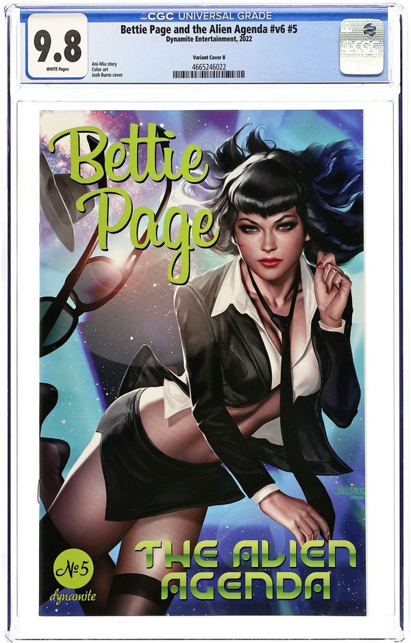 Written by Ani-Mia. Art by Celor. Cover by Josh Burns. Poor Bettie Page has barely finished up her latest adventure and gotten back to modeling when duty calls once more! Seems there's something funny going on in a place called Roswell, and it's up to Bettie to investigate! There's a catch this time, though-the United States military might be putting Bettie on the case, but they can't avow the existence of said case-or Bettie! Instead, our marvelous model is given a crack team of assistants to help her go where no woman has gone before! Fresh off scribing Bettie Page and the Bigfoot Bandits, this spaceship is steered with a purpose by fan-favorite Ani-Mia and illustrated with only the finest stardust by Celor (Hack/Slash vs. Chaos!, Kiss: The Phantom Obsession)! 32 pages, full color. Rated T+ Cover price $3.99.