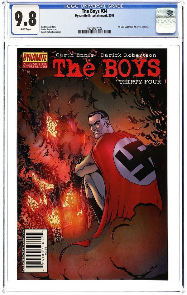 Webster's Vault, AnZ Comics, and BeachSide Hobbies Exclusive "Homelander" virgin cover by Ivan Tao. Dynamite Reprint Edition. Written by Garth Ennis. Art and Cover by Darick Robertson. Need the perfect jumping-on point for The Boys after binging it on Prime? Here you go! Dynamite never actually had the honor of publishing issue #1 of The Boys (we started with #7), but now we're doing it here as a special, limited edition. Don't miss out on where it all began! 32 pages, full color. Mature Readers. NOTE: Do not confuse with the 2006 Wildstorm printing.