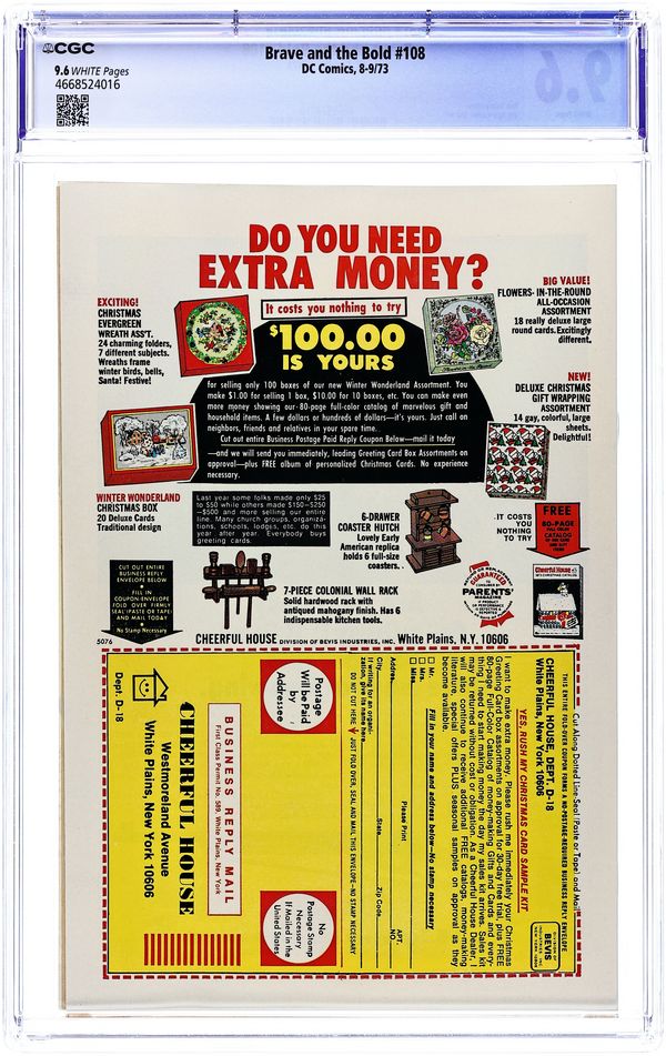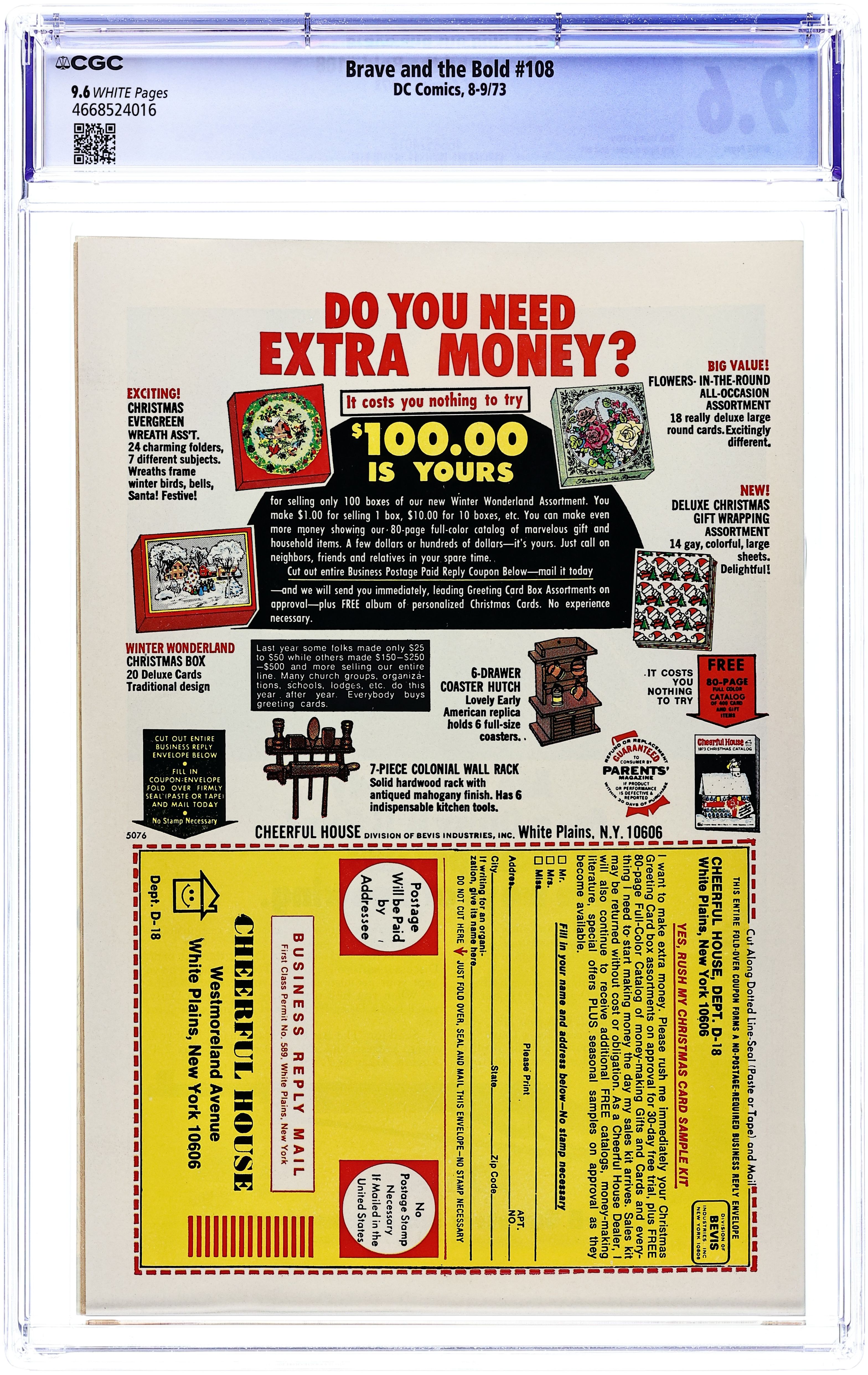 Ends Jan 13 8:24 PM CST Bid History 6 bids Current Bid $59 Your Secret Max Bid If you'd like to bid, please log in or register. Giant-size issue. Cover by Nick Cardy. "Mansion of the Misbegotten!", script by Bob Haney, art by Jim Aparo; When Batman goes to visit his old friend Roger Birnam, who is dying, he promises to watch over Birnam's wife Clorinda and his son Enoch; After the funeral, when a man who posed as Birnam's doctor and as a religious articles salesman turns out at the Gotham morgue, victim of a ritual murder, Batman rushes to Birnam Towers to check on Birnam's family; Batman soon finds himself caught in a Satanic cults rituals, which involve little Enoch. Reprint back-up story (from Phantom Stranger 1, September 1952): "The Killer Shadow!" starring Phantom Stranger, script by John Broome, pencils by Carmine Infantino, inks by Sy Barry. Reprint back-up story: "One Challenger Must Die" starring the Challengers of the Unknown, script by Arnold Drake, art by Bob Brown. Article in which Jim Aparo talks about his career. 52 Pages, Full Color. Cover price $0.25.
