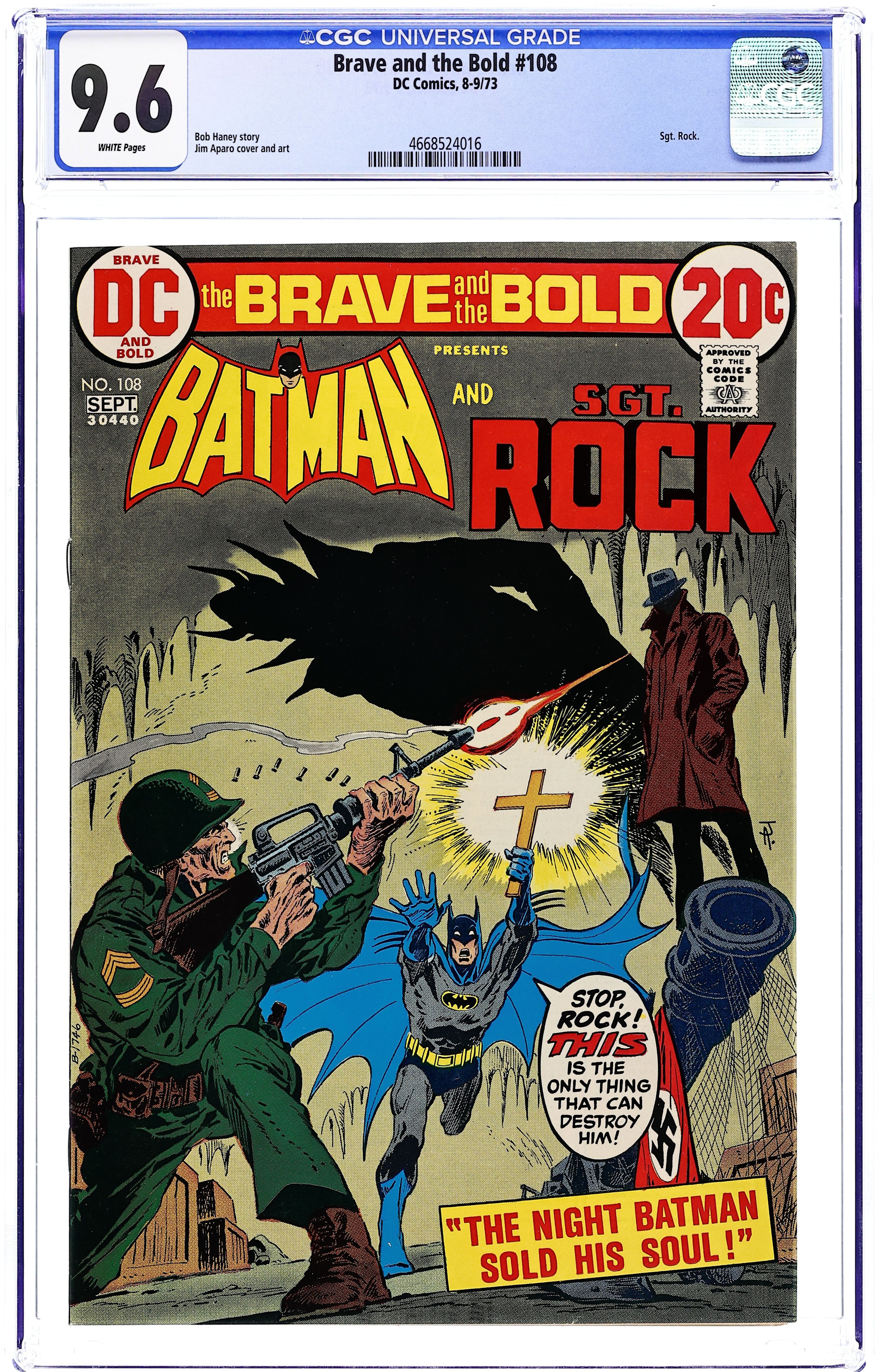 Cover by Jim Aparo. "The Night Batman Sold His Soul!", script by Bob Haney, art by Jim Aparo; When trying to save a hostage boy, Batman is shot with a bullet and left for dead, however he is saved by a shadowed behind whom Batman believes is the devil and that his life is in forfeit; However, after running into Sgt. Rock once more, Rock explains that the mystery being who saved his life is really Adolf Hitler, who has survived all these years and is still behind hunted by Sgt. Rock; Batman and Rock then team up to track down Hitler, although the two manage to destroy his operations, Hitler manages to make his escape, much to Rock's frustration. Letter from comics writer and editor Bob Rozakis. 36 Pages, Full Color. Cover price $0.20.