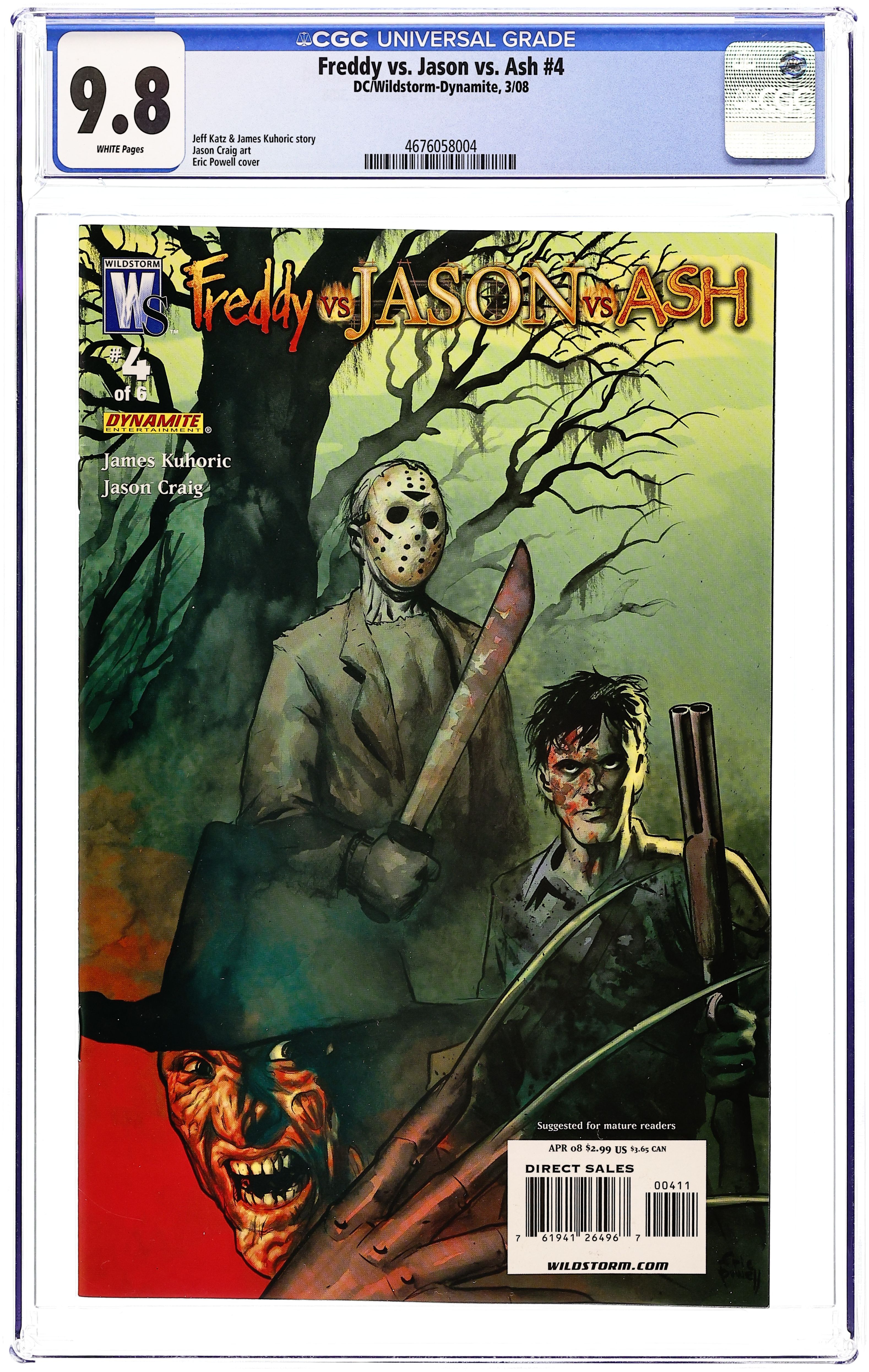 Written by Jeff Katz and James Kuhoric. Art by Jason Craig. Cover by Shane Davis and Sandra Hope. Zombies, Deadites, and demons - oh my! The army of the dead is loose in Washington, D.C. and no one is safe from their rampage. As the capital city burns, Freddy Krueger's devious plan starts to come together. No longer is he limited to the kids from Springwood or Crystal Lake. Now the world is his Elm Street, and the streets will flow with blood. Jason Voorhees leads the dead in the sacking of D.C. that cuts down everyone from shoppers to senators. Things are looking grim for Ash's Nightmare Warriors as Tommy Jarvis and Jacob Johnson are taken captive, leaving a depleted group to figure out how to stop the storm of slaughter taking place in the streets. Pulled into Freddy's nightmare, they are given an ultimatum: 'Bring the Necronomicon to me or I'll gut your friends while you watch.' It's all-out Armageddon in the White House when Freddy takes his place on the highest seat in the land...the Oval Office. 32 pages, full color. MATURE READERS. Cover price $3.99.