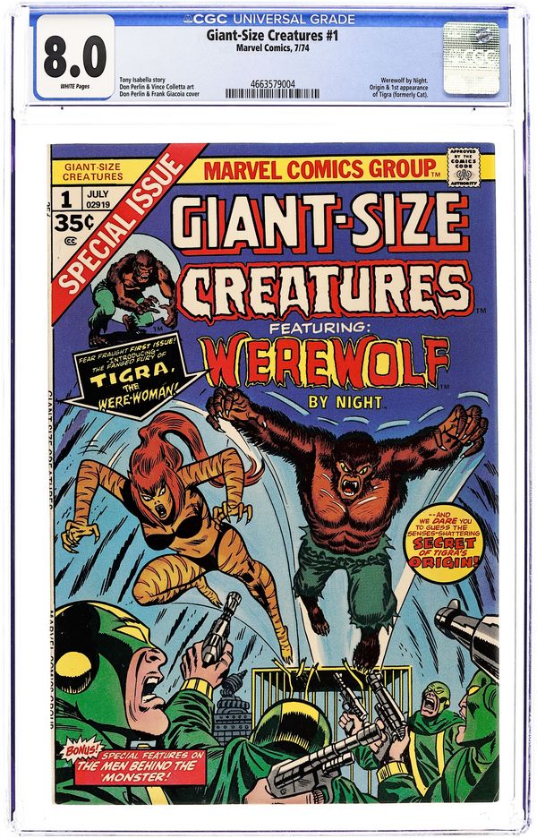 52-page giant. New story: "Tigra the Were-Woman!", script by Tony Isabella, pencils by Don Perlin, inks by Vince Colletta; Greer Nelson, formerly known as The Cat, is transformed by the Cat People into Tigra. Tigra and the Werewolf By Night free the Cat People from Hydra. "Waiter, There's a Werewolf in My Soup!" article by Roy Thomas, art by Don Perlin; Text piece detailing the origins of the Werewolf By Night strip. "Where Walks the Werewolf!" (reprinted from Creatures on the Loose #13), script by Len Wein, art by Reed Crandall; A blind man has the eyes of a wolf transplanted into himself, and becomes a werewolf. "Tigra's Year" article by Tony Isabella; Details how the ideas behind Tigra came about. Includes the original pencil design sketch of Tigra by Gil Kane. 52 pgs., full color. Cover price $0.35.