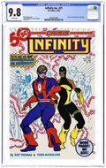 Story by Jim Starlin. Art by Ron Lim and Al Milgrom. The sequel to Infinity Gauntlet. Somewhere deep in space on a nameless planet the titan Thanos discovers a new threat to the existence of the universe and investigates. Meanwhile, all across the globe key super-heroes are attacked by evil dopplegangers. Thanos comes face to face with the ones responsible, the Magus, evil counterpart to Adam Warlock, and the titan's own doppleganger. As Reed Richards gathers the world's heroes the World Devourer Galactus sends his herald to contact the Master of the Mystic Arts, Dr. Strange. All this plus the unholy alliance of Dr. Doom and Kang the Conqueror. Story by Jim Starlin. Art by Ron Lim and Al Milgrom. 48 pages. Cover price $2.50.