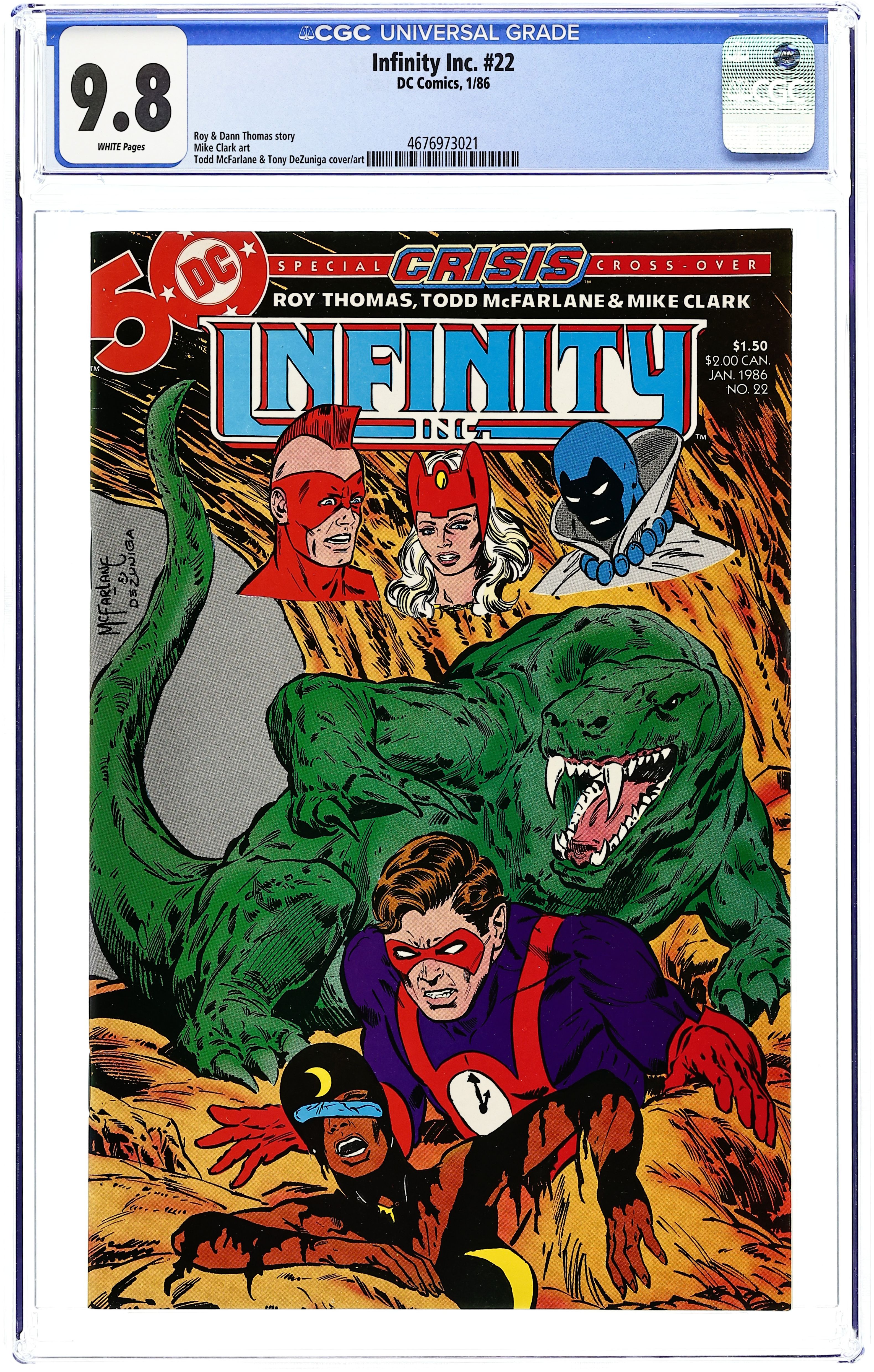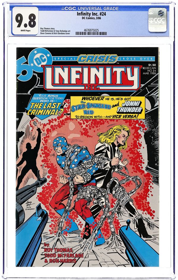 Crisis On Infinite Earths crossover. Commander Steel and Mekanique recruit Infinity Inc. to travel to Earth-One and take on the JLA in "Last Crisis On Earth-Two!" Part 1 of 2, continued in Justice League of America #244. Script by Roy Thomas, co-plot by Dann Thomas, pencils by Todd McFarlane, inks by Steve Montano. Letters page includes profile of McFarlane written and drawn by McFarlane himself. McFarlane/Tony DeZuniga cover. Cover price $1.25.