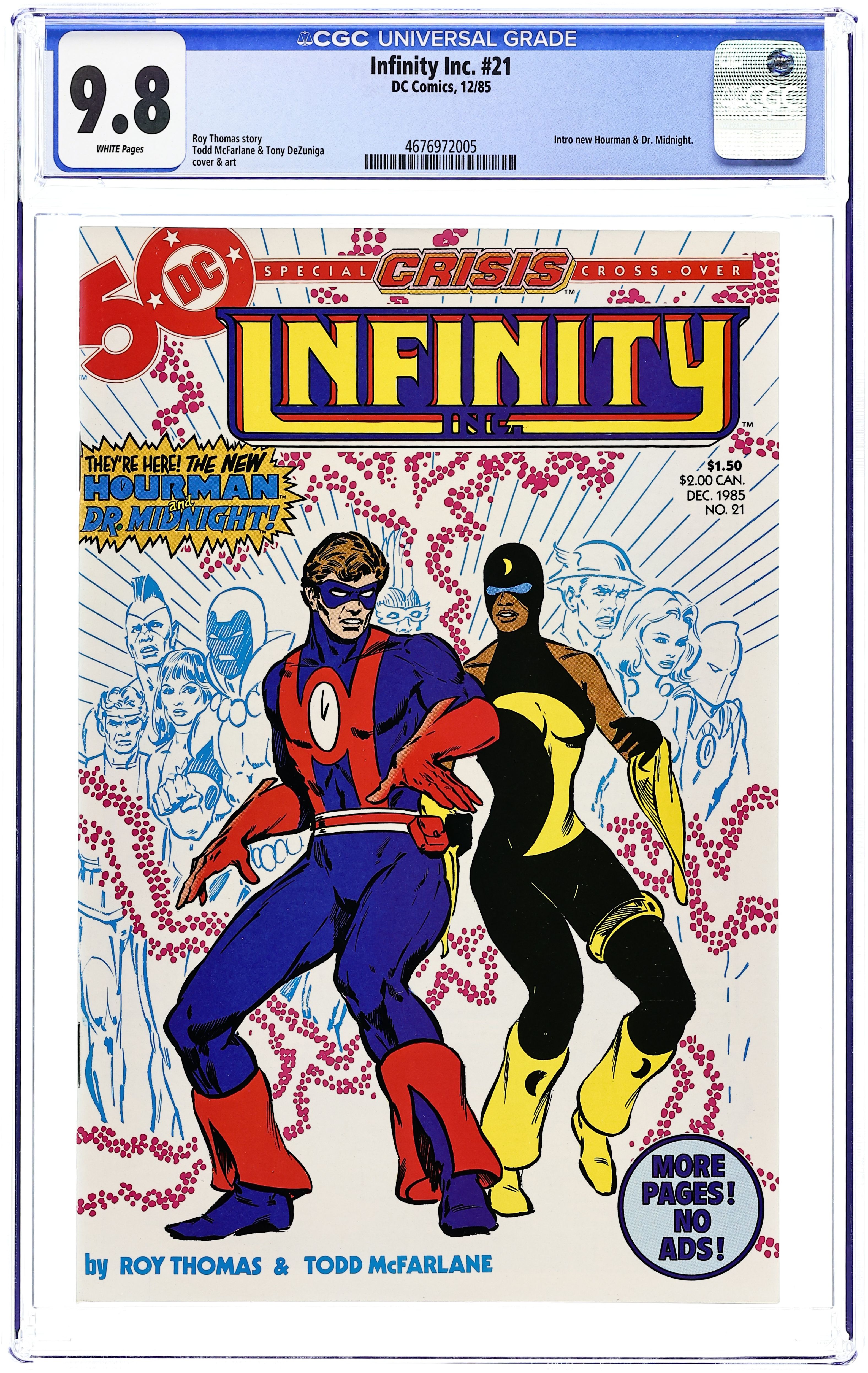 Crisis On Infinite Earths crossover. Featuring the debuts of the new Hourman and Dr. Midnight in "Shadows At Midnight!" Story takes place after Infinity Inc. Annual #1. Crisis story thread continues in Crisis On Infinite Earths #5. Script by Roy Thomas, co-plot by Dann Thomas, pencils by Todd McFarlane, inks by Steve Montano and Tony DeZuniga. No ads. 28 pages of story. McFarlane/ DeZuniga cover. Cover price $1.50.