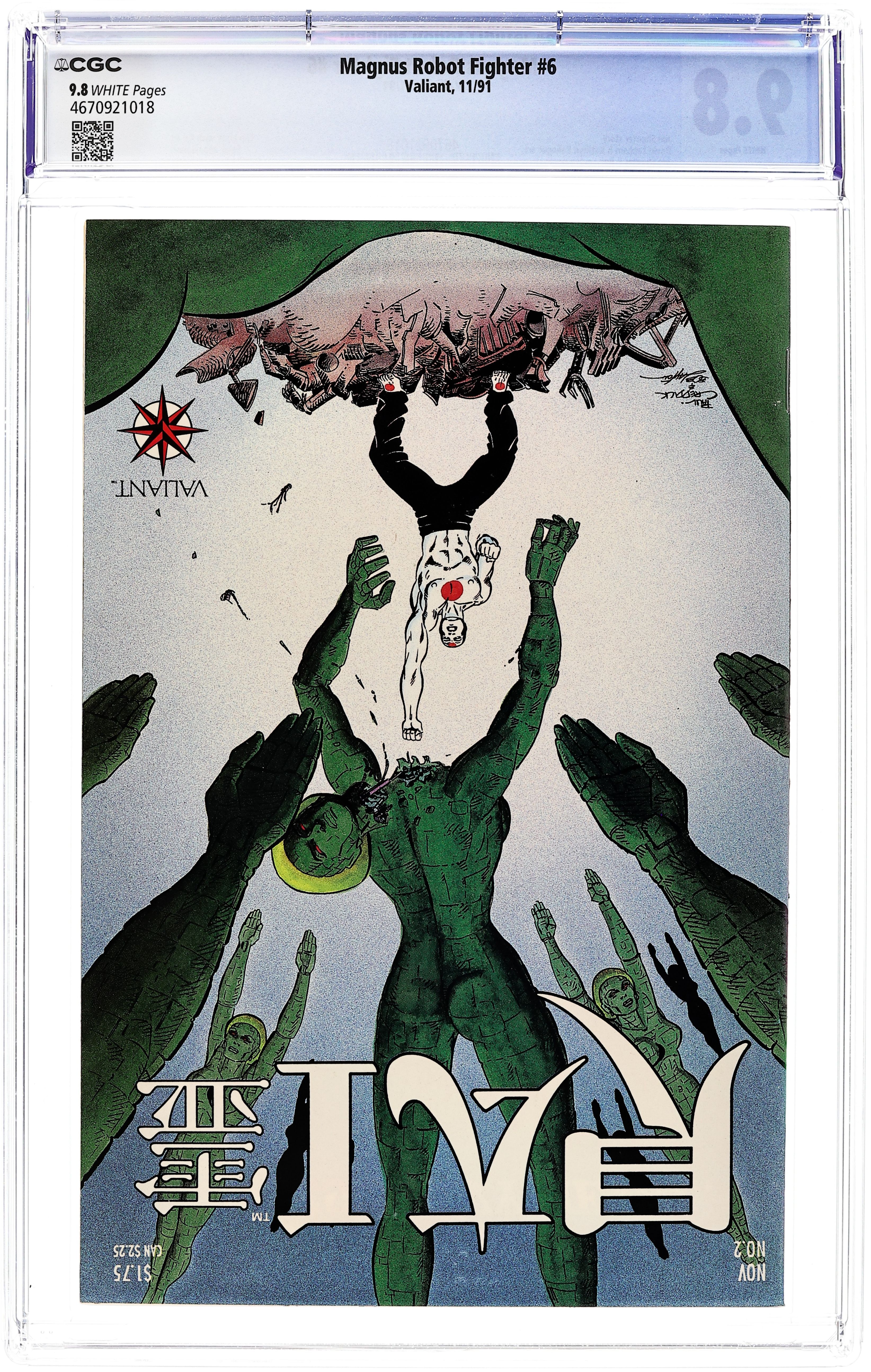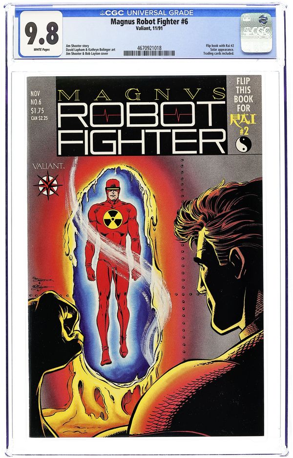 Trading Card insert in centerfold. Coupon is on the back of the trading cards, not separate! The freewill robots attack and wage war on North Am while Magnus discovers a telltale sign of how to tell if a robot has freewill or not and continues to question whether or not these robots are alive or just machines in "Steel Nation Part Two -- Soldier." Script by Jim Shooter and art by Art Nichols & Bob Layton & Kathryn Bolinger. Cover price $1.75.
