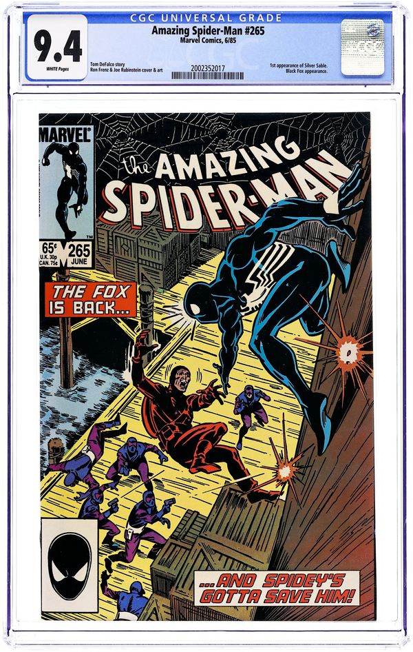 Ends Jan 15 7:29 PM CST Bid History 12 bids Current Bid $175 Your Secret Max Bid If you'd like to bid, please log in or register. First printing. Direct Edition. First appearance of Silver Sable. Script by Tom DeFalco. Pencils by Ron Frenz. Inks by Joe Rubinstein. Cover by Ron Frenz and Joe Rubinstein. "After the Fox!". The Black Fox is on the run! But it's not the Spectacular Spider-Man who's chasing him! It's Silver Sable! An adventurer for hire from the European country of Symkaria! Silver Sable and her Wild Pack pursue the fox through the streets of Manhattan and then later corner him on the waterfront! However, the aging international jewel thief has a wall-crawling guardian angel! Down on the docks, the sparks fly as the web-slinger gives Silver Sable a lesson in diplomacy...superhero-style! Second appearance of the Black Fox. Cameo appearances by Aunt May, Mary Jane Watson, Harry Osborn, Liz Osborn, and Normie Osborn. (Notes: Silver Sable appears next in Amazing Spider-Man 279. The Black Fox returns in Web of Spider-Man 14. There is a second printing of this issue published in 1992. The second printing features a gray cover and a yellow dog ear touting the first appearance of Silver Sable. This story was also reprinted in Marvel Tales 277.) 36 pgs. Cover price $0.65.
