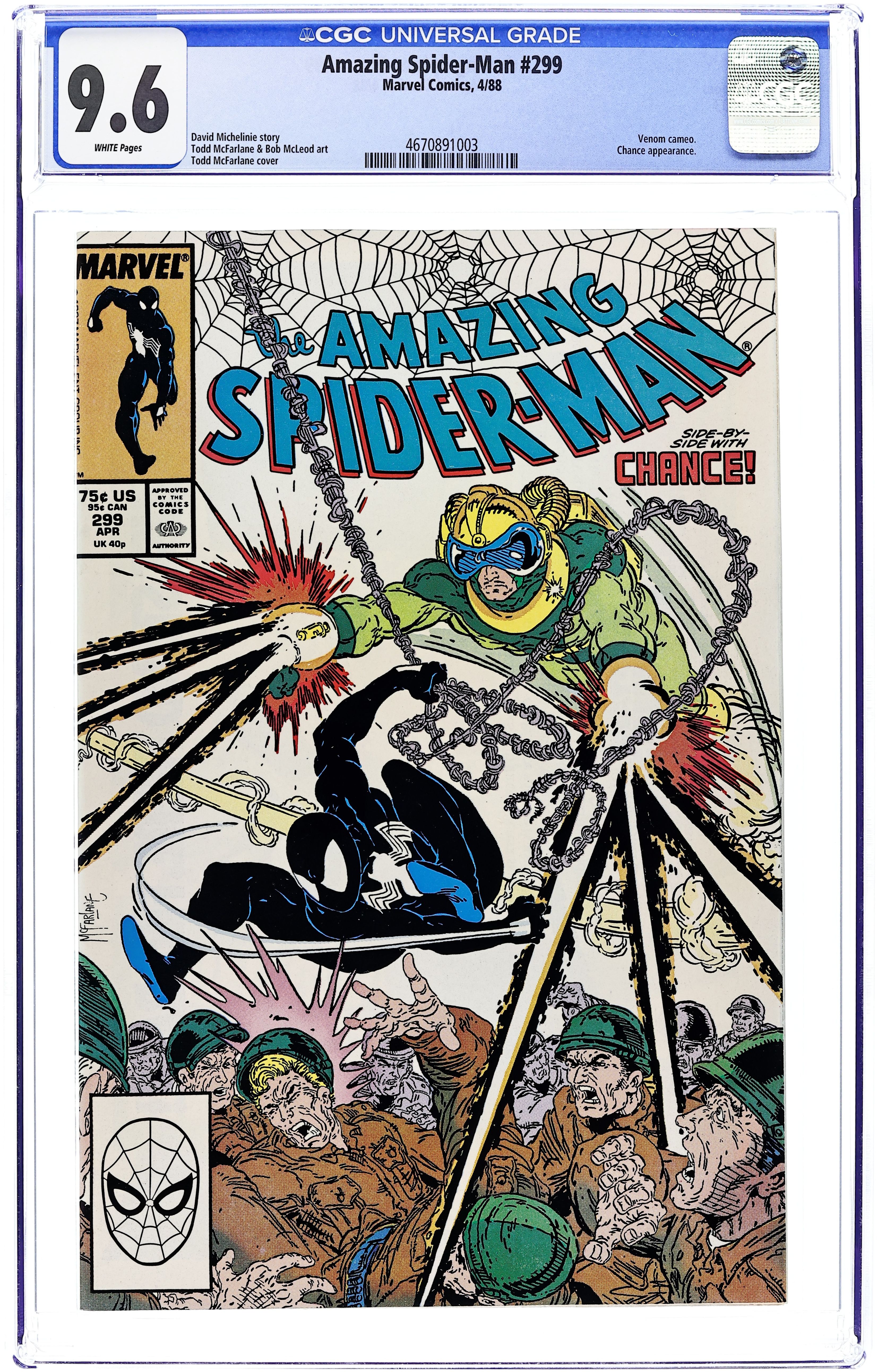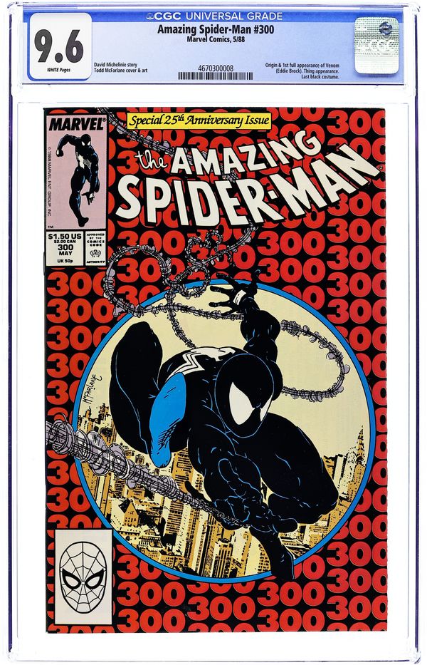 Ends Jan 15 7:30 PM CST Bid History 39 bids Current Bid $495 Your Secret Max Bid If you'd like to bid, please log in or register. Direct Edition. Giant-sized 25th anniversary issue. First full appearance of Venom in "Venom!", script by David Michelinie, art by Todd McFarlane; Spidey's old alien costume has merged with reporter Eddie Brock who thinks his career was ruined by Spider-Man and the symbiote of the two, Venom, takes on the web slinger; At MJ's request, Spidey returns to the blue and red costume as she now finds his black duds way too creepy; This is the last issue in which Spider-Man appears in his black costume; Thing (of the Fantastic Four) cameo.. Stan's Soapbox Special in place of letters page: Full page editorial by Stan on the occasion of Spider-Man's 300th issue. 52 pgs., full color. Cover price $1.50.