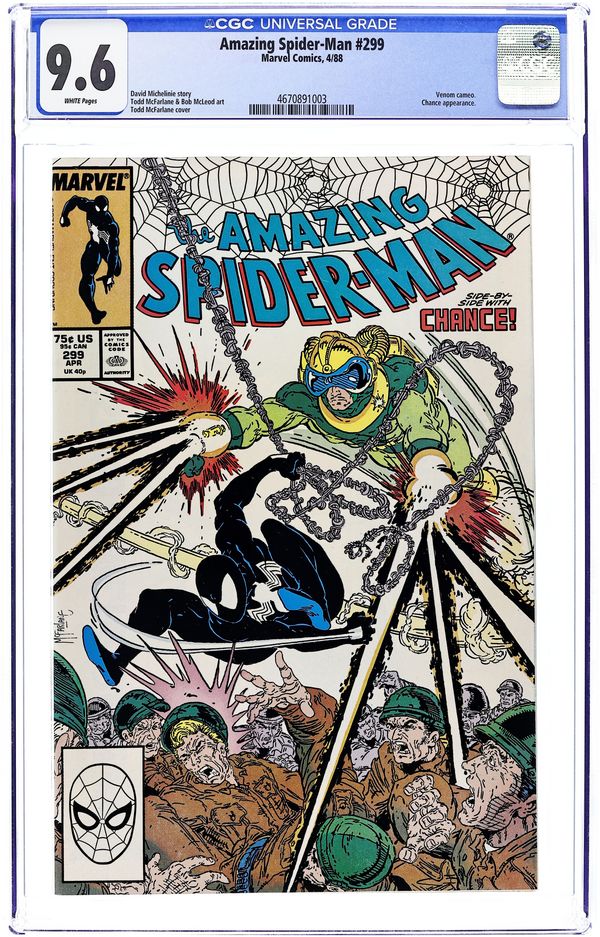 Ends Jan 15 7:30 PM CST Bid History 9 bids Current Bid $165 Your Secret Max Bid If you'd like to bid, please log in or register. Direct Edition. "Survival of the Hittist!" Part 2 of 2. Script by David Michelinie. Pencils by Todd McFarlane. Inks by Bob McLeod. Cover by Todd McFarlane. After their waterfront arms theft goes awry, the Life Foundation turns the tables on Chance! The mysterious survivalist group abducts the mercenary and takes him to their secret headquarters in northern New Jersey! But thanks to a well-placed spider tracer, the web-slinger infiltrates the foundation's secluded colony the next day...and rescues Chance! So now the adversaries of 24 hours ago suddenly become allies to avoid death...courtesy of the Life Foundation! First appearance (and cameo on the last page) by Venom. Cameo appearances by Eddie Murphy, Paul Schaffer, and Joe Robertson. Last 75¢ issue. 36 pages, full color. (Note: Chance returns in Amazing Spider-Man 336.) Cover price $0.75.