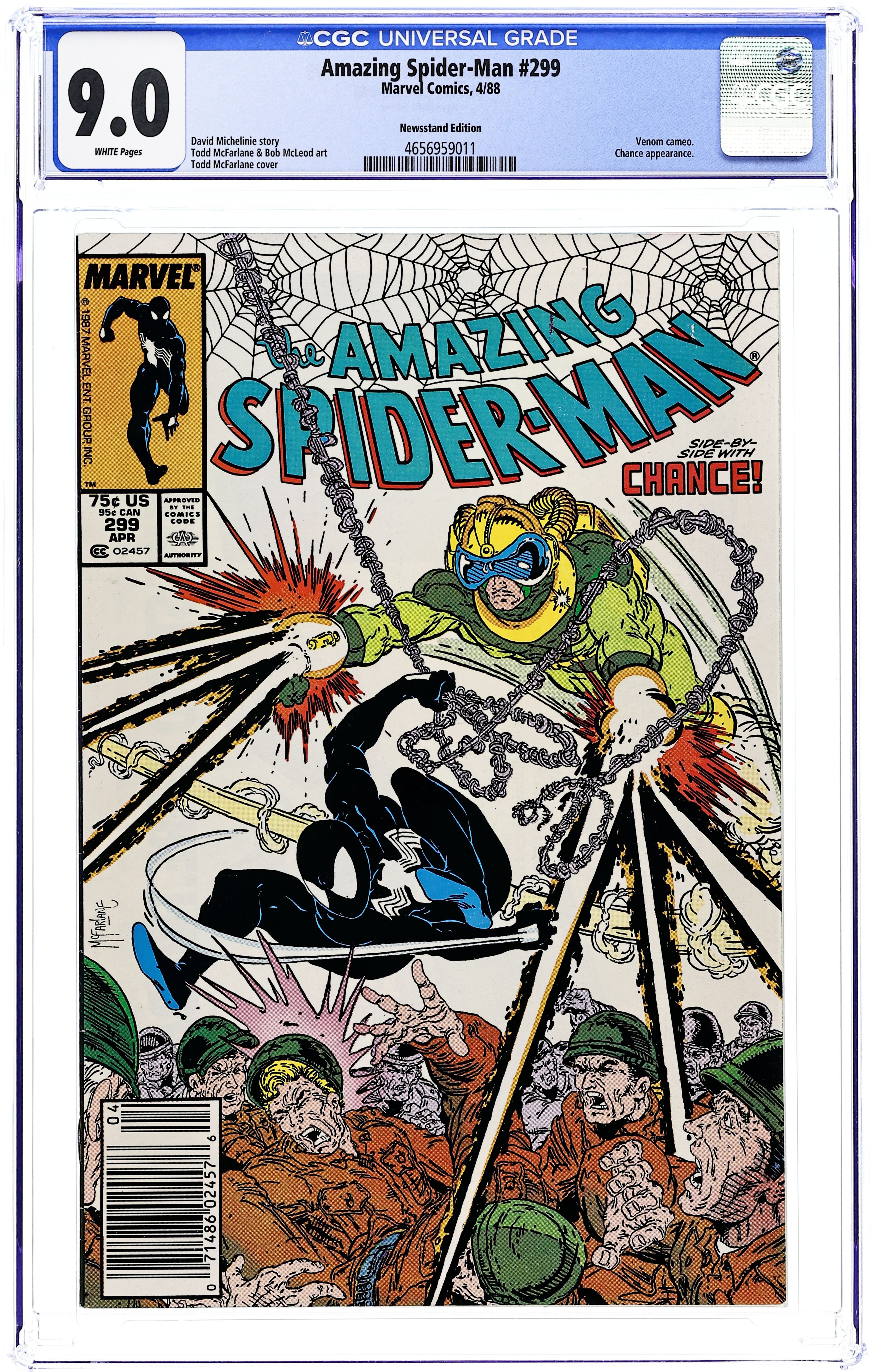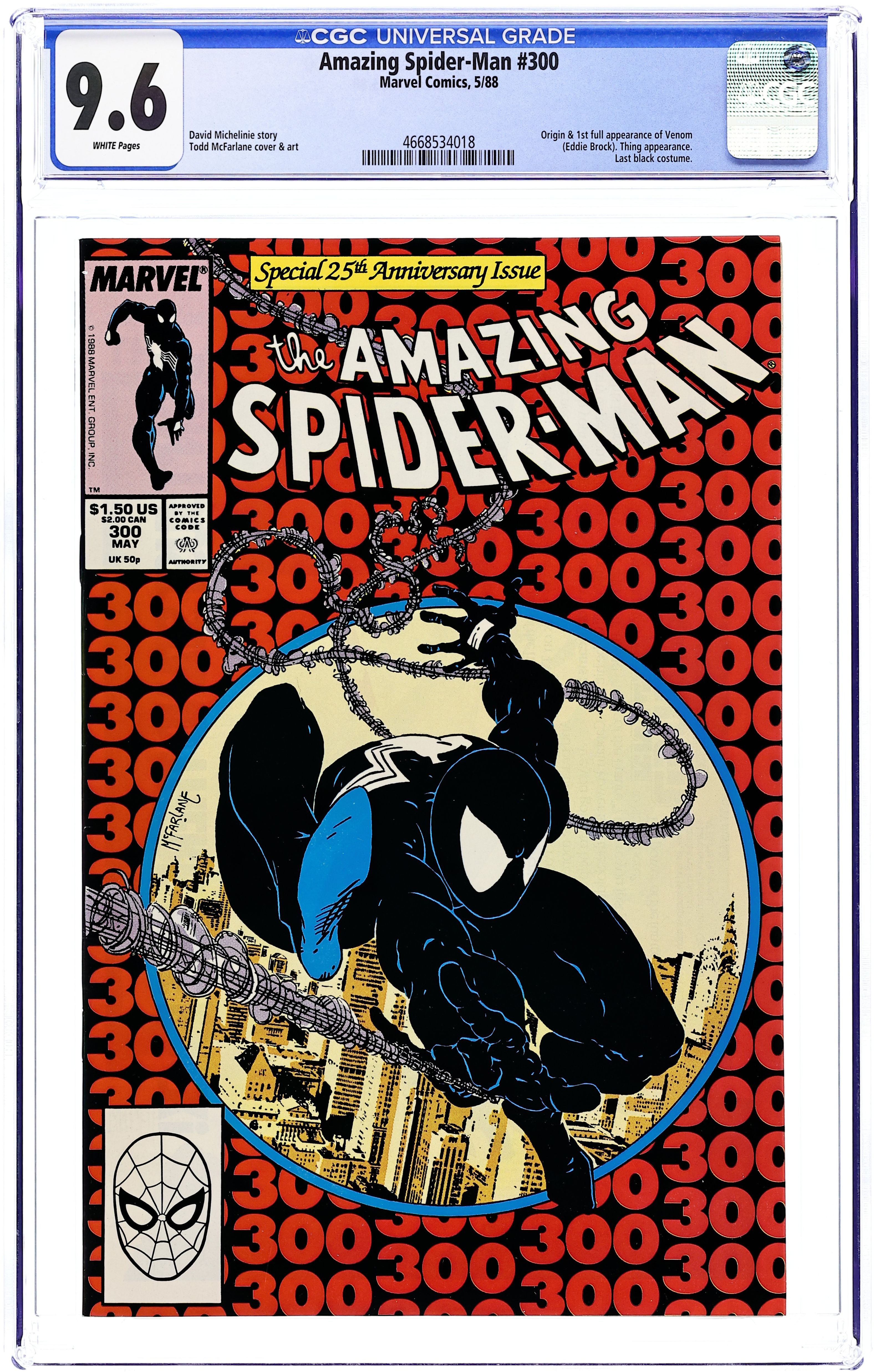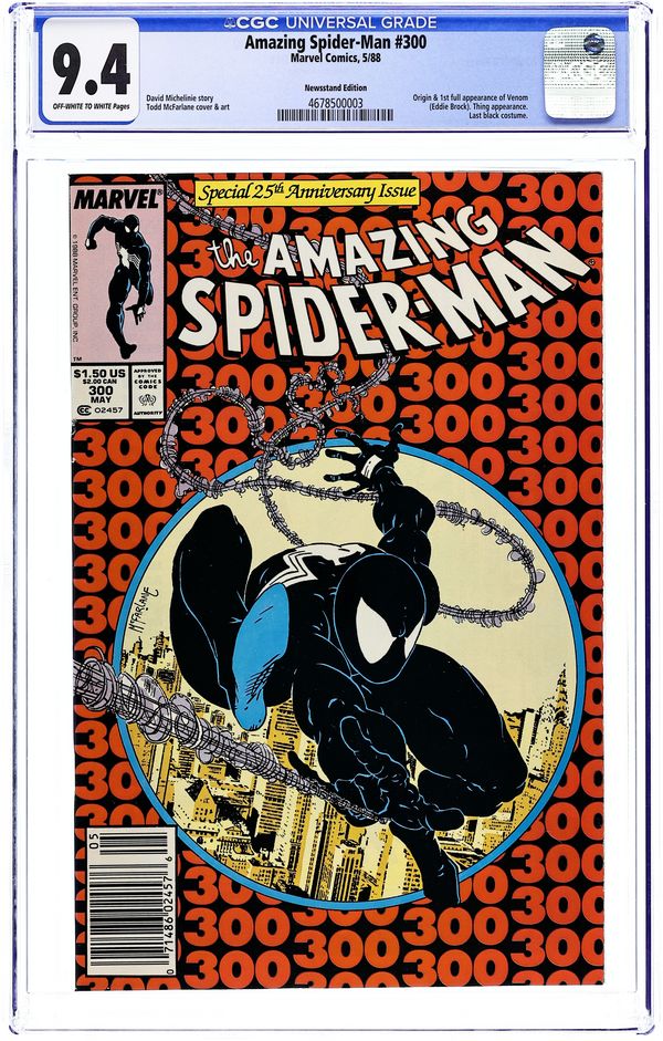 Ends Jan 15 7:31 PM CST Bid History 43 bids Current Bid $510 Your Secret Max Bid If you'd like to bid, please log in or register. Newsstand Edition. Giant-sized 25th anniversary issue. First full appearance of Venom in "Venom!", script by David Michelinie, art by Todd McFarlane; Spidey's old alien costume has merged with reporter Eddie Brock who thinks his career was ruined by Spider-Man and the symbiote of the two, Venom, takes on the web slinger; At MJ's request, Spidey returns to the blue and red costume as she now finds his black duds way too creepy; This is the last issue in which Spider-Man appears in his black costume; Thing (of the Fantastic Four) cameo.. Stan's Soapbox Special in place of letters page: Full page editorial by Stan on the occasion of Spider-Man's 300th issue. 52 pgs., full color. Cover price $1.50.