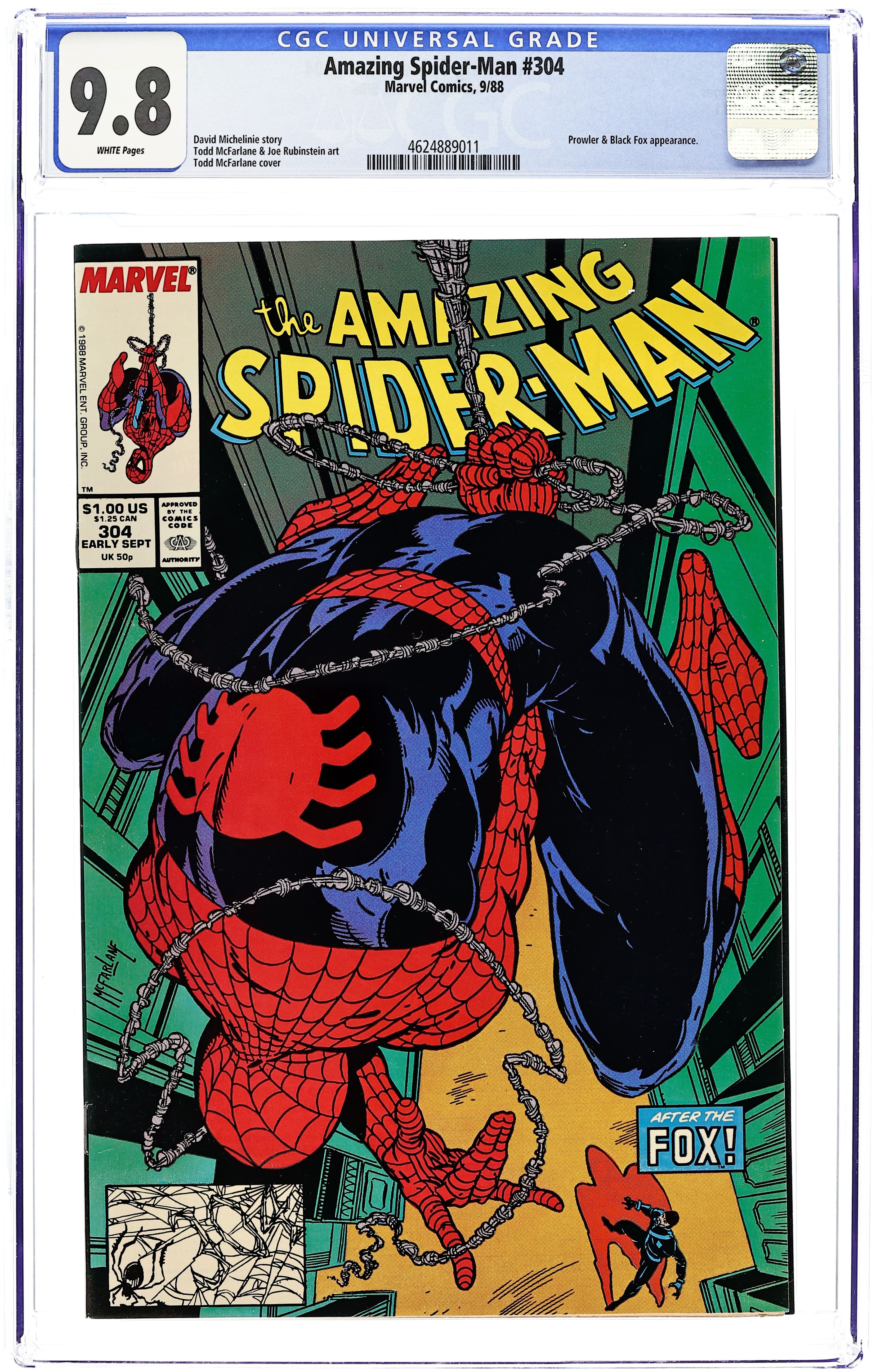 Direct Edition. "California Schemin'!" Part 1 of 2. Script by David Michelinie. Pencils by Todd McFarlane. Finishes by Joe Rubinstein. Cover by Todd McFarlane. The Daily Bugle publishes a book featuring Peter Parker's best photos of Spider-Man! And now the Bugle's ace photographer and Mary Jane are on their way to Los Angeles for the publicity tour! It should be all fun in the sun in the city of angels! But Peter's first promotional event at the L.A. civic center hits a snag when an old acquaintance shows up: the Black Fox! The wily fox steals a priceless chalice and the chase is on! Is the web-slinger ready for his Hollywood debut? Cameo appearances by Aunt May, J. Jonah Jameson, and the Prowler. First appearance of Jonathan Caesar. (Notes: The Black Fox previously appeared in Web of Spider-Man 15. The Amazing Spider-Man title was published bi-monthly for the next 5 issues.) 36 pgs. Cover price $1.00.