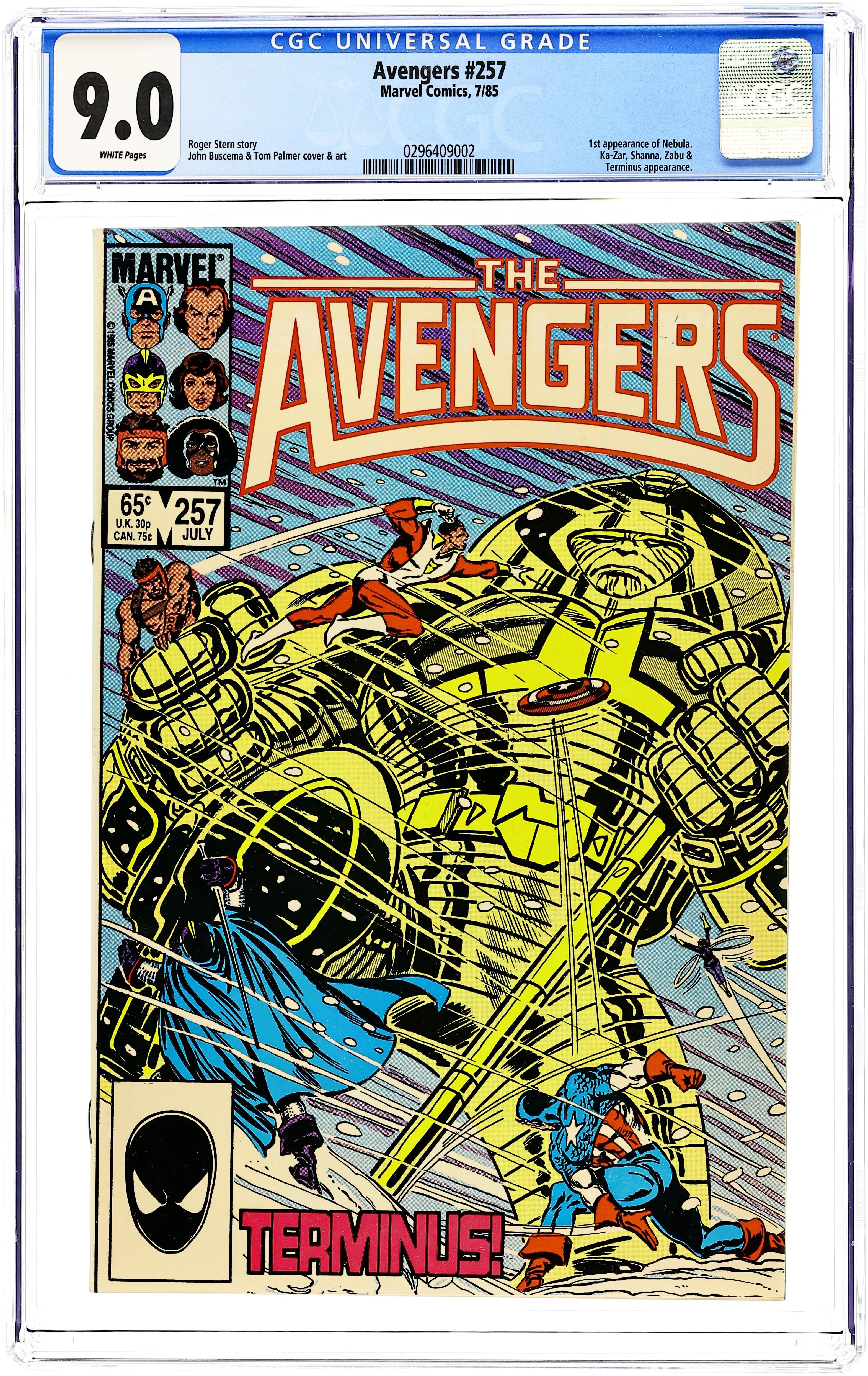 Newsstand Edition. "Duty Over All!" Guest-starring Firelord. Script by Roger Stern. Art by John Buscema (breakdowns) and Tom Palmer (finishes). Cover by John Buscema and Tom Palmer. In the depths of the Andromeda Galaxy, Nebula and her band of mercenaries score a major hit on the remnants of the Skrull empire! However, during the attack, Captain Marvel is finally able to relay a message back to Avengers Mansion! And shortly thereafter five avengers plus Firelord blast off into space and then through subspace to reach the galaxy next door. Fortunately, the Avengers quickly locate Captain Marvel and meet the crescent city avenger's new allies: the Skrulls! Hold on…teaming up with the Skrulls, is that allowed in the Avengers' playbook?! But adversity makes strange bedfellows, and the Skrulls and the Avengers join forces to challenge Nebula! Cameo appearances by She-Hulk and Wyatt Wingfoot. Flashback cameo by Galactus to recap the events of Fantastic Four 257. 36 pgs. Cover price $0.65.