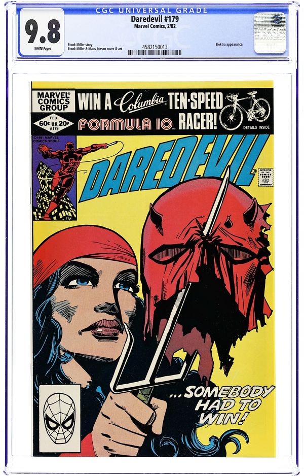 Ends Dec 29 7:57 PM CST Bid History 2 bids Current Bid $16 Your Secret Max Bid If you'd like to bid, please log in or register. Direct Edition. Cover pencils by Frank Miller, inks by Klaus Janson. The Damned, script by Frank Miller, pencils by Frank Miller (breakdowns) and Klaus Janson (finished art), inks by Klaus Janson; Following the lead on a photo Ben took, DD hunts for the Kingpin's missing wife in the sewers; Cherryh wins the mayoral election, but in exchange for his wife's return, Kingpin makes him concede; Kingpin orders Elektra to kill Foggy in retaliation; begins a chain of events that will result in Elektra's battle with Bullseye in issue 181. Letter to the editor from comics editor Diana Schutz. 36 pgs. Cover price $0.60. Cover price $0.60.