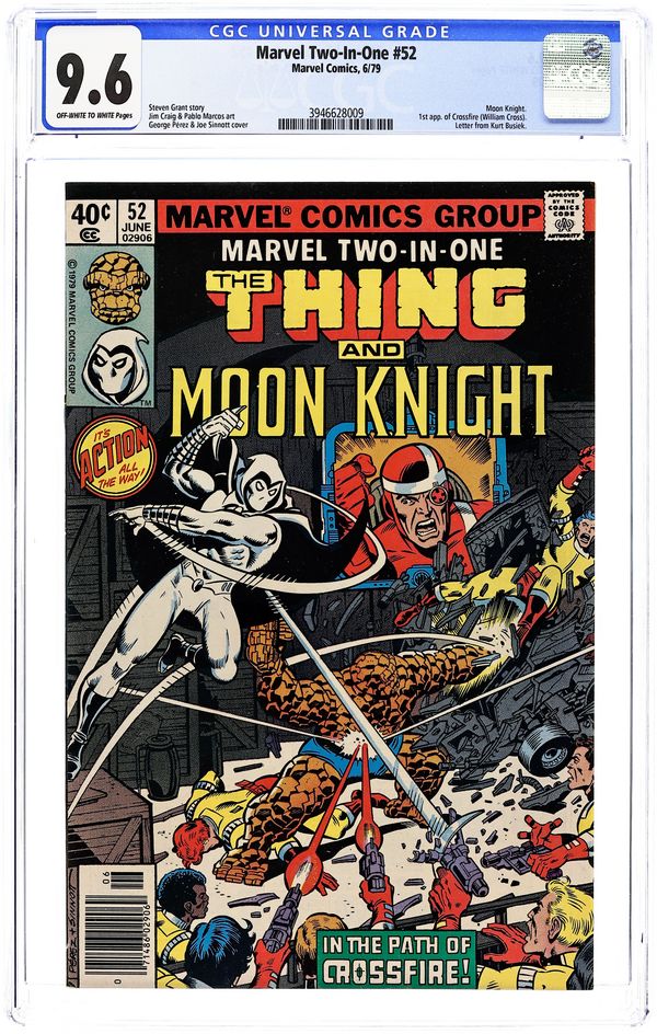 Cover by George Pérez and Joe Sinnott. "In the Path of Crossfire!" Guest-starring Moon Knight. Story by Steve Grant. Art by Jim Craig and Pablo Marcos. The Thing meets the mysterious Moon Knight and they must find a way to work together if they're going to take down the nefarious Crossfire. Cover price $0.40.