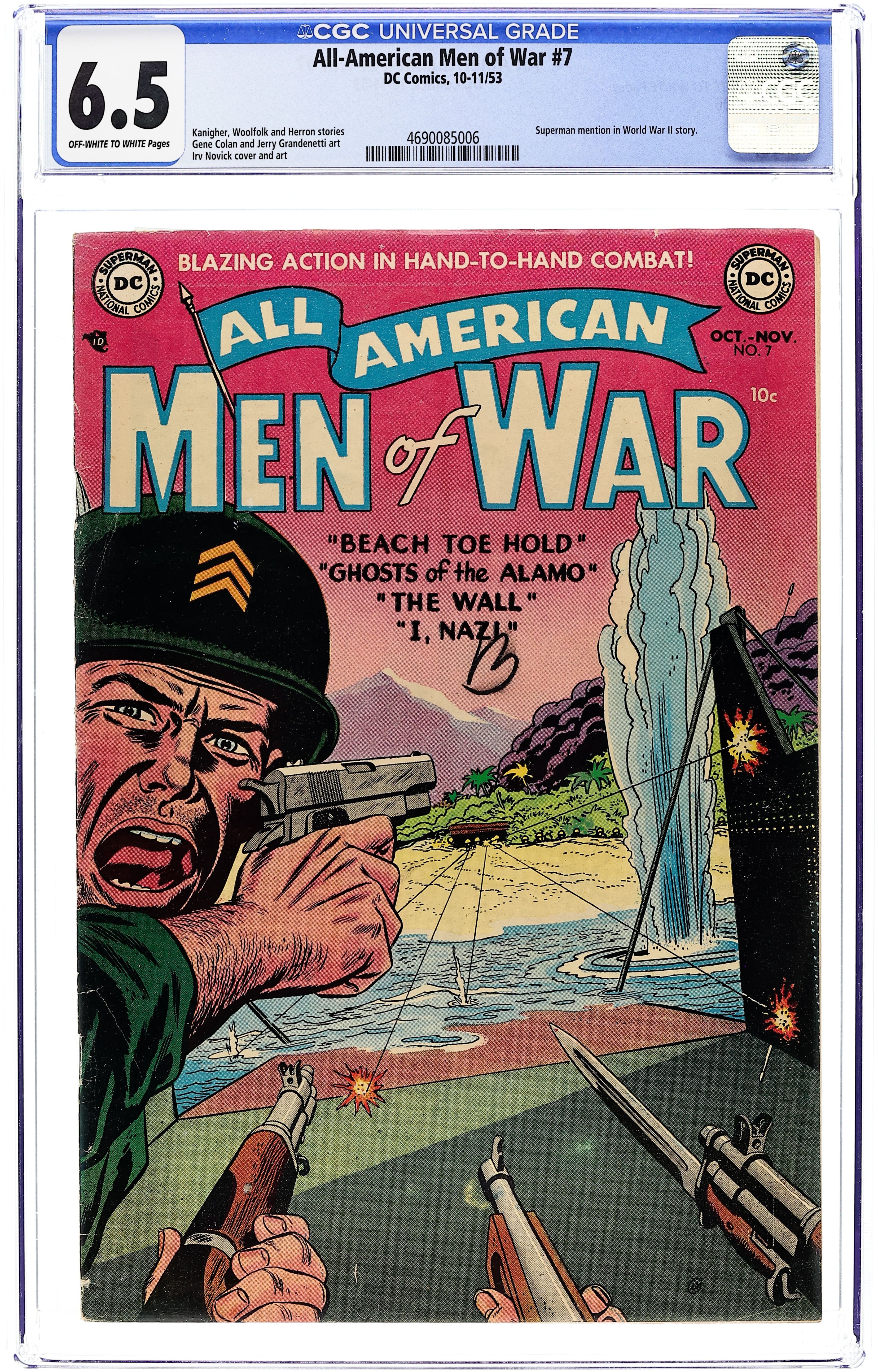 Ends Apr 13 7:07 PM CST Bid History no bids Minimum Bid $1 Your Secret Max Bid If you'd like to bid, please log in or register. Edited by Whitney Ellsworth (credited) and Robert Kanigher (actual). Cover by Jerry Grandenetti. Stories by Robert Kanigher, Jerry Grandenetti, Bernard Sachs, David V. Reed, Irv Novick, Joe Giella, Irwin Hasen, Art Wallace, Jerry Grandenetti, Joe Giella, Bill Woolfolk, Frank Giacoia, and Sy Barry. Adventure tales of war and the military, including some humor—go into combat with All American Men of War! 36 Pages, Full Color. Cover price $0.10.