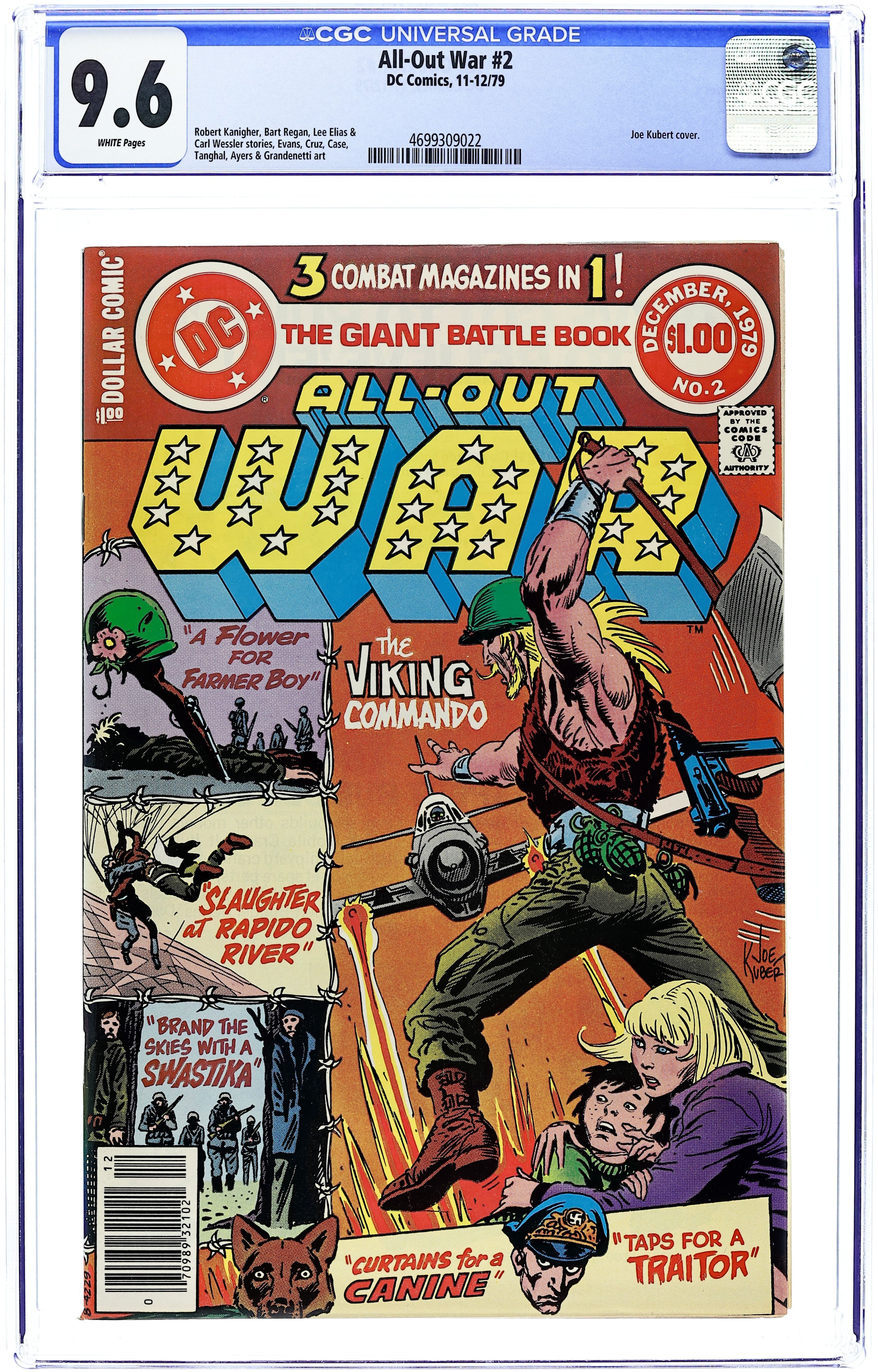 Newsstand Edition. Cover art by Joe Kubert. Should Old Acquaintance Be Destroyed, script by Roy Thomas and Gerry Conway ("Steel" sequence), pencils by Adrian Gonzales and Don Heck ("Steel" sequence), inks by Jerry Ordway; the JSA battles Steel; Steel first assumes the code name Commander Steel. Franklin D. Roosevelt, Winston Churchill and Adolf Hitler appearance. 36 pgs. $0.60. Cover price $0.60.