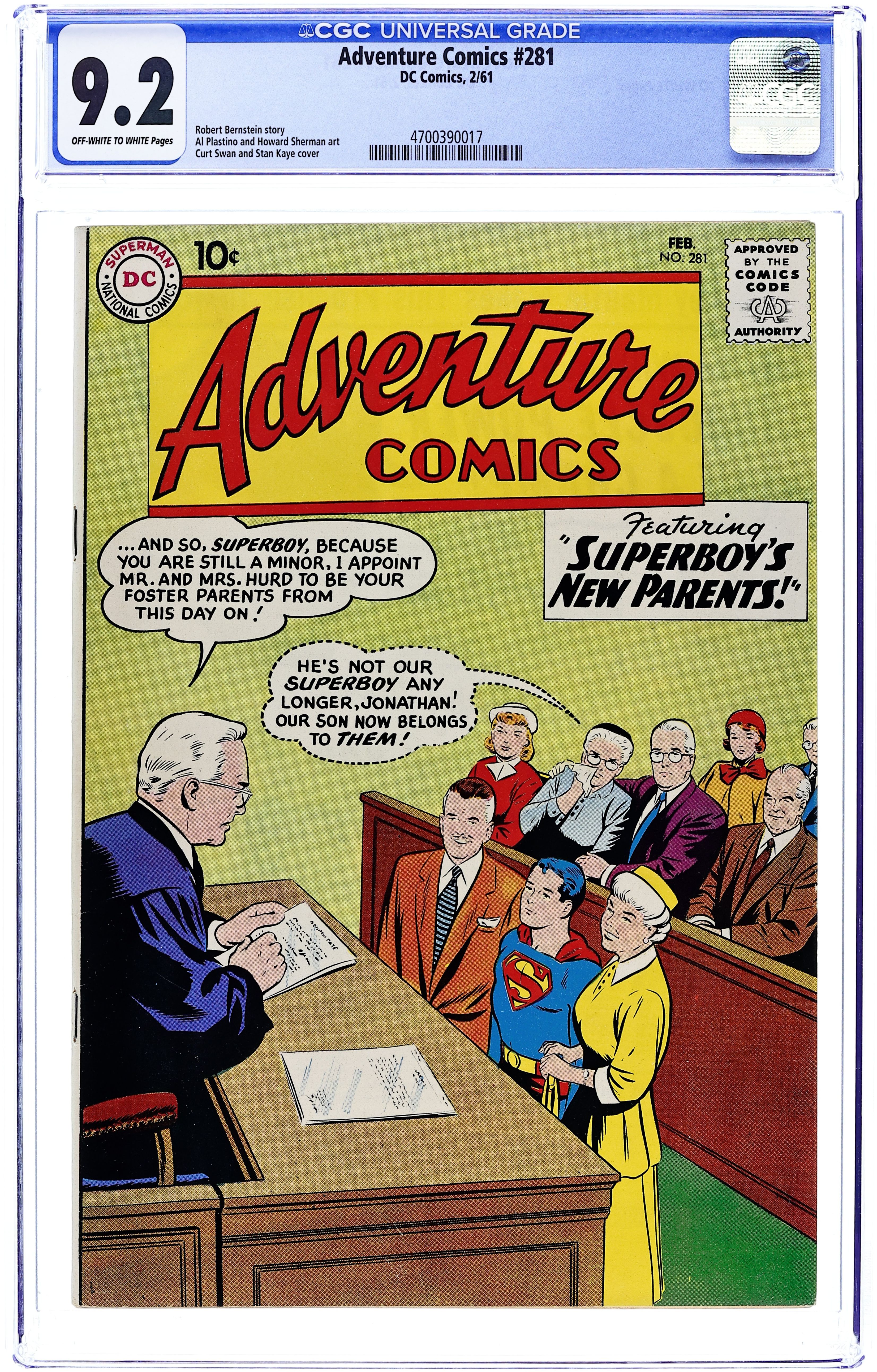 Ends Apr 14 7:02 PM CST Bid History 1 bid Current Bid $1 Your Secret Max Bid If you'd like to bid, please log in or register. Cover pencils by Curt Swan, inks by Stan Kaye. 1st appearance of the Phantom Zone in The Phantom Superboy, script by Robert Bernstein, art by George Papp; After Professor Lang finds a box of Kryptonian weapons, Superboy is accidentally projected into the Phantom Zone, the place where Kryptonian criminals were exiled. A Salute to Our American Indians public service announcement, script by Jack Schiff, art by Bernard Baily. The Lion with the Double Identity starring Congorilla, script by Robert Bernstein, art by Howard Sherman. Little Pete humor page by Henry Boltinoff. 36 pages, Full Color. Cover price $0.10.