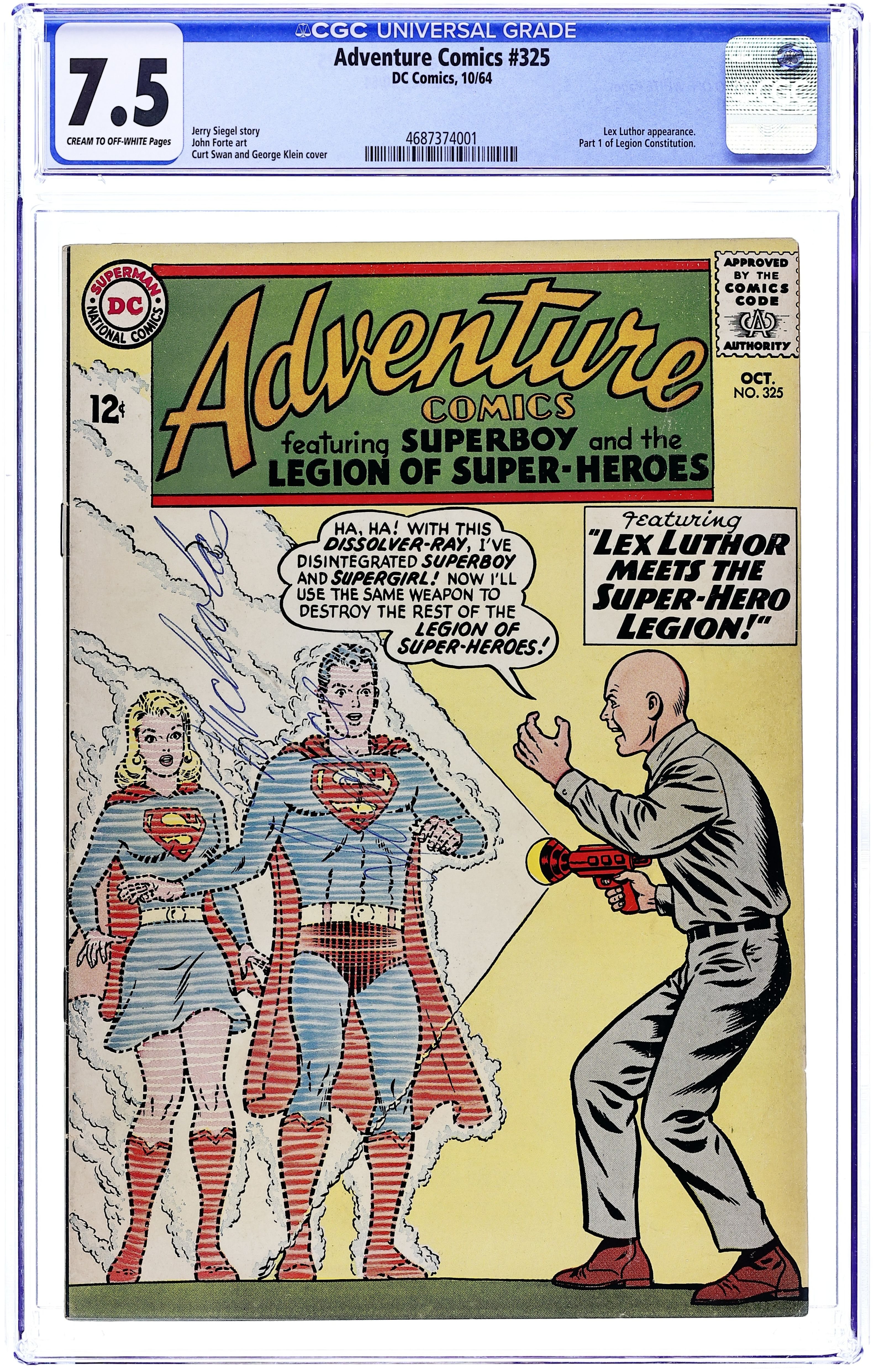 Cover pencils by Curt Swan, inks by George Klein. The Super-Planet of Clark Kent and Lana Lang, art by George Papp; Lana and Clark are accidentally transported to a strange world where Clark must make her think they both have superpowers in order to prevent her from guessing he's Superboy. House ad for Superman Annual #5. Tales of the Legion of Super-Heroes series begins in The Face Behind the Lead Mask!, script by Jerry Siegel, pencils by John Forte, Al Plastino (page 4 and some Superboy and Luthor heads only), inks by John Forte and Al Plastino; At a regular meeting of the Legion of Super-Heroes, the Legionnaires lose control of their powers; Mon-el joins the Legion. 36 pages, Full Color. Cover price $0.12.