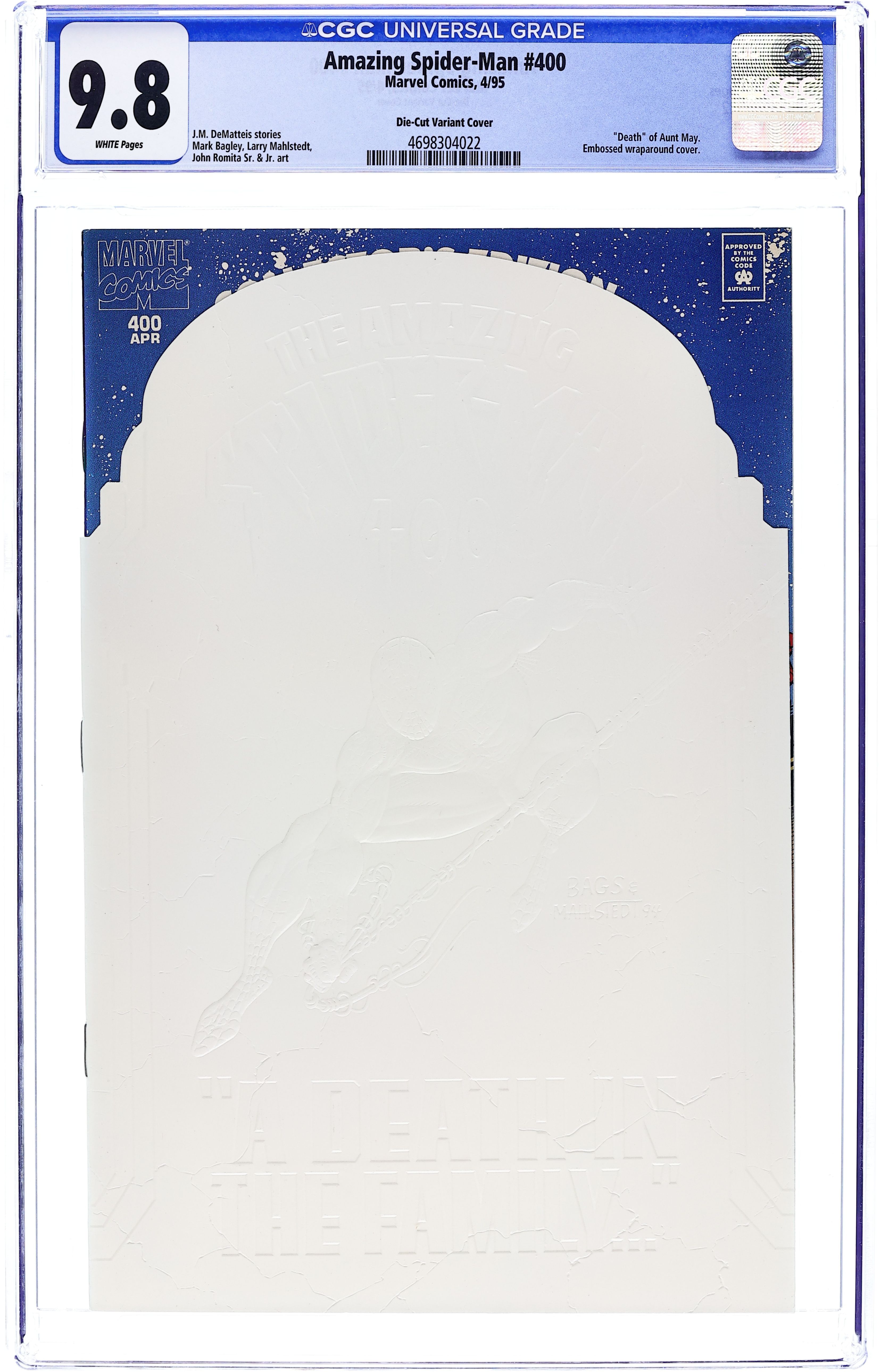 White (not gray) Tombstone Overlay Variant cover edition One of only ten thousand printed. Death of Aunt May in "The Gift." Script by J.M. DeMatteis, pencils by Mark Bagley, inks by Larry Mahlstedt. Scarlet Spider guest stars. Back-up story, "A Shock to the System." Script by J.M. DeMatteis, pencils by John Romita Jr., inks by John Romita Sr. (Story continues in Spider-Man 57.) Back-up story, "The Morning After." Plot by J.M. DeMatteis, script by Stan Lee, pencils by Tom Grummett, inks by Al Milgrom. 72 pgs.