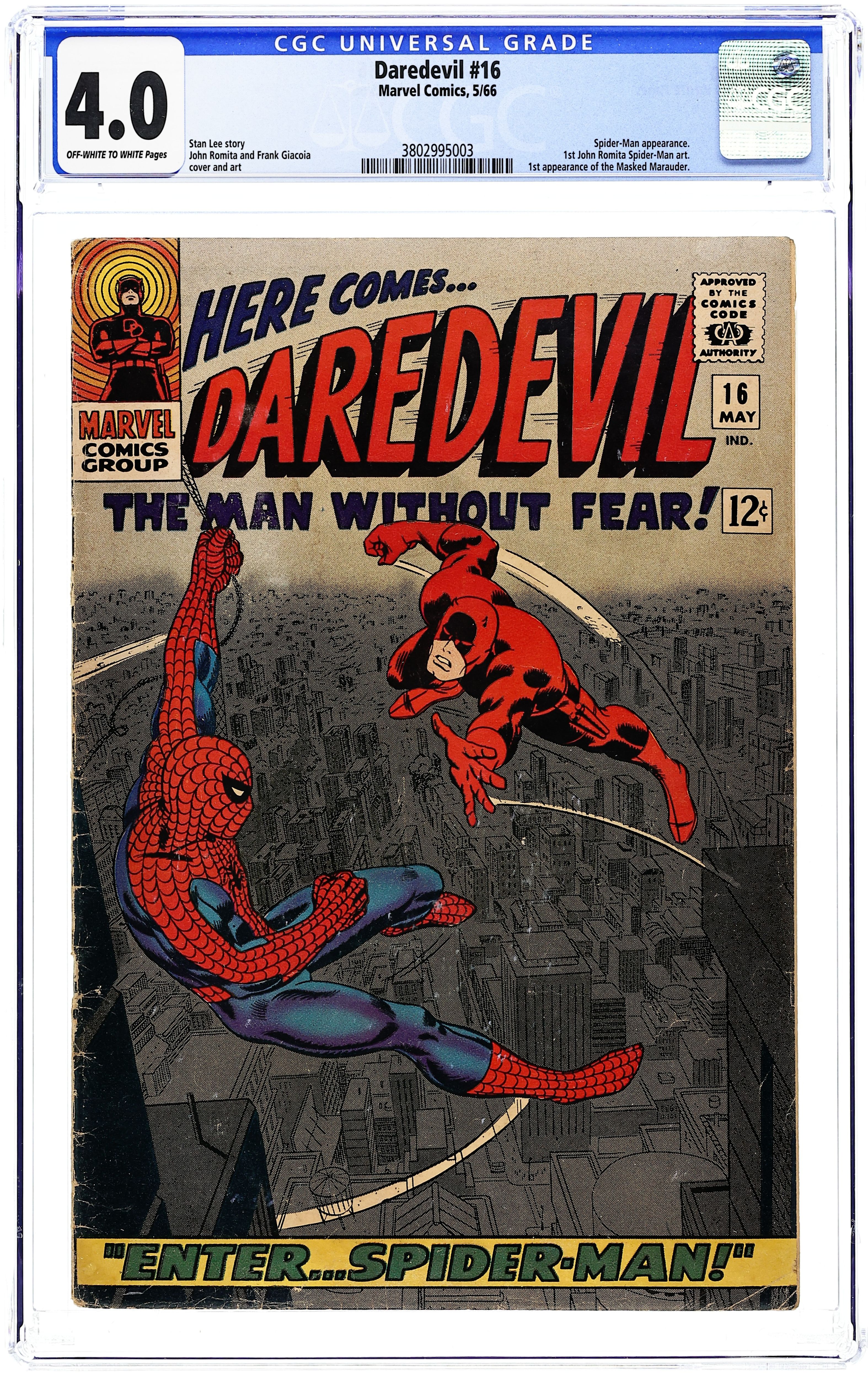 Cover pencils by John Romita, inks by Frank Giacoia. Spider-Man guest stars in Enter Spider-Man!, script by Stan Lee, pencils by John Romita Sr., inks by Frank Giacoia (as "Frank Ray"); The Masked Marauder comes up with a plan to pit Spidey and DD against each other while he makes off with an experimental engine; First appearance of the Masked Marauder. Letter to the editor from comics retailer Bud Plant. 36 pgs. 36 pgs. Cover price $0.12. Cover price $0.12.