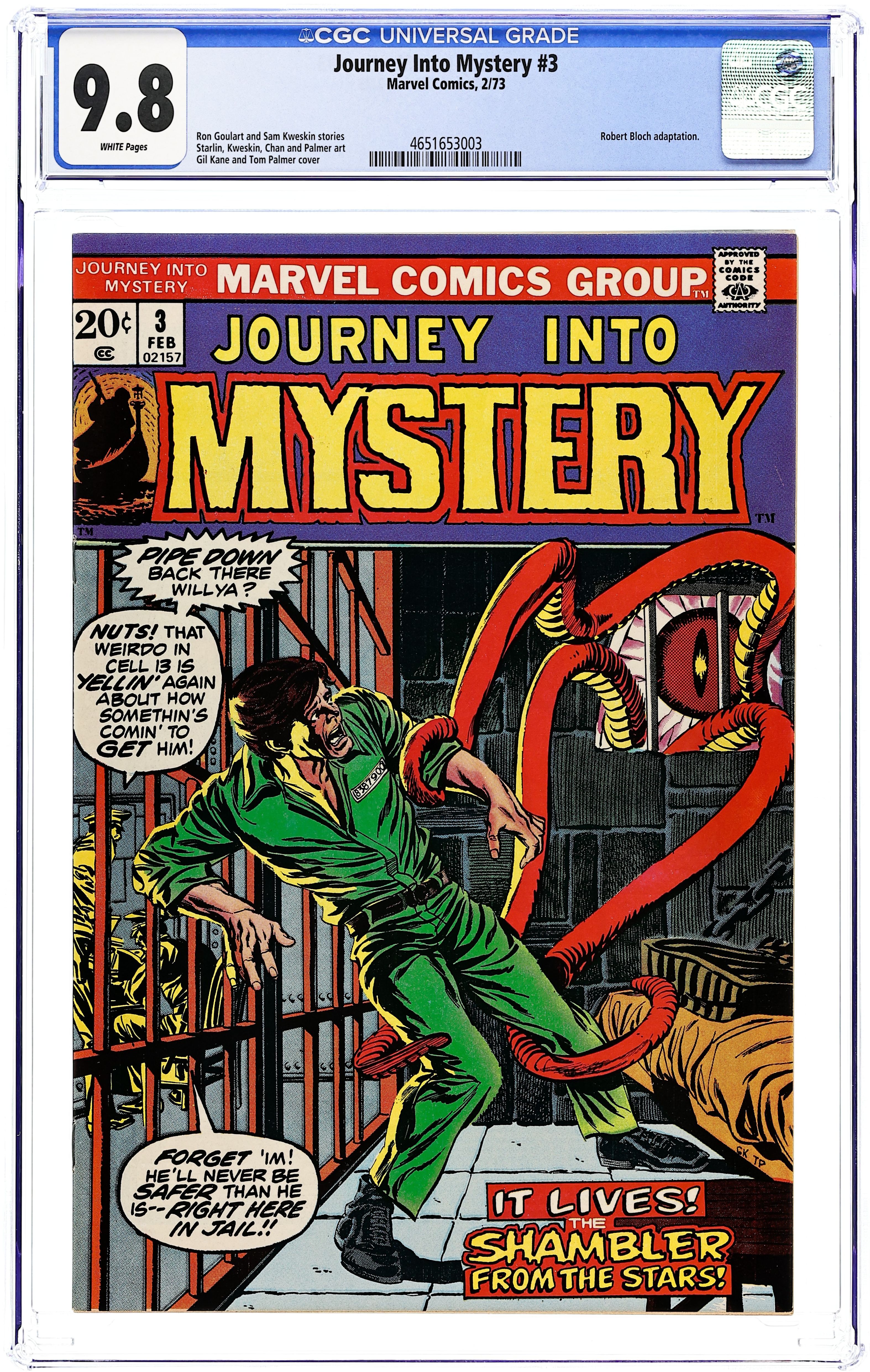 Cover by Gil Kane and Tom Palmer. The Shambler from the Stars!, script by Ron Goulart (adaptation) and Robert Bloch (priginal story), art by Jim Starlin and Tom Palmer; A writer becomes obsessed with an ancient forbidden book of magic, and murders its owner to steal it; However, translation of the book releases a loathsome evil from beyond space and time. Revenge From the Rhine, script by Sam Kweskin, art by Sam Kweskin and Ernie Chan (as Ernie Chua); A German pilot breaks the armistice to kill one more French flier and attain a high military honor, but the testimony of his own men prevents the honor. He murders those who testified against him, and years later all his victims return to kill him in return. Ad for Supernatural Thrillers #2, art by Jim Steranko. Genius, script by Stan Lee, art by Joe Maneely; An intelligent man grows tired among life on Earth as mere humans are like children to him when he receives a telepathic message from what appears to be a beautiful woman on Saturn imploring him to build a rocket to journey to her. 36 pgs., full color. $0.20. Cover price $0.20.