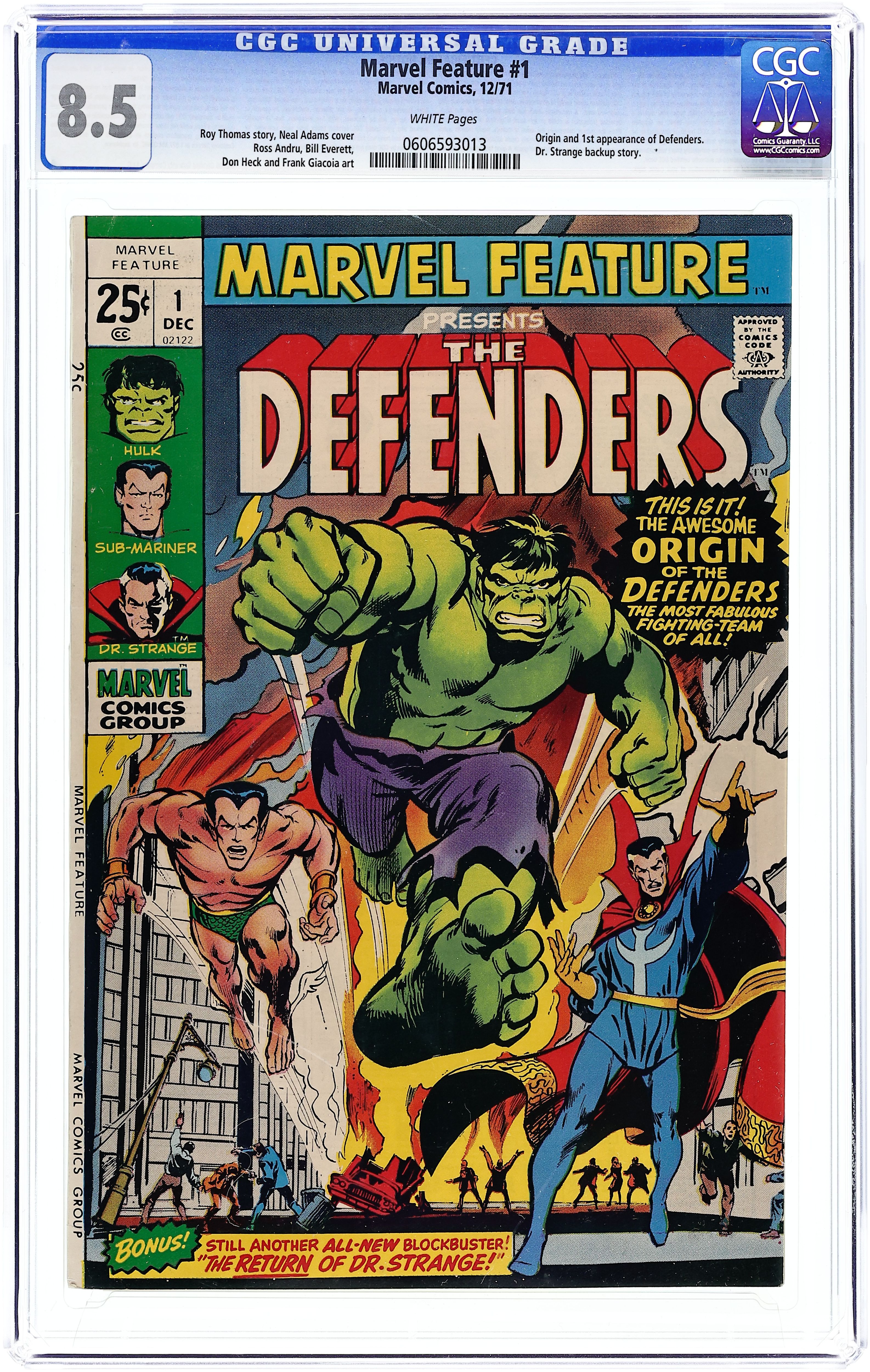 Giant-size issue; 1st appearance and origin of the Defenders (featuring Sub-Mariner, Hulk, and Doctor Strange). Cover by Neal Adams. "The Day of the Defenders!," script by Roy Thomas, pencils by Ross Andru, inks by Bill Everett; The Defenders must stop Yandroth from destroying the Earth with the Omegatron. "The Sub-Mariner and the Icebergs" featuring Namora, Tha-Korr, and Byrrah, script and art by Bill Everett. "The Return!," script by Roy Thomas, pencils by Don Heck, inks by Frank Giacoia; Stephen Strange becomes Doctor Strange again to stop Baron Mordo. 52 pgs., full color. $0.25. Cover price $0.25.