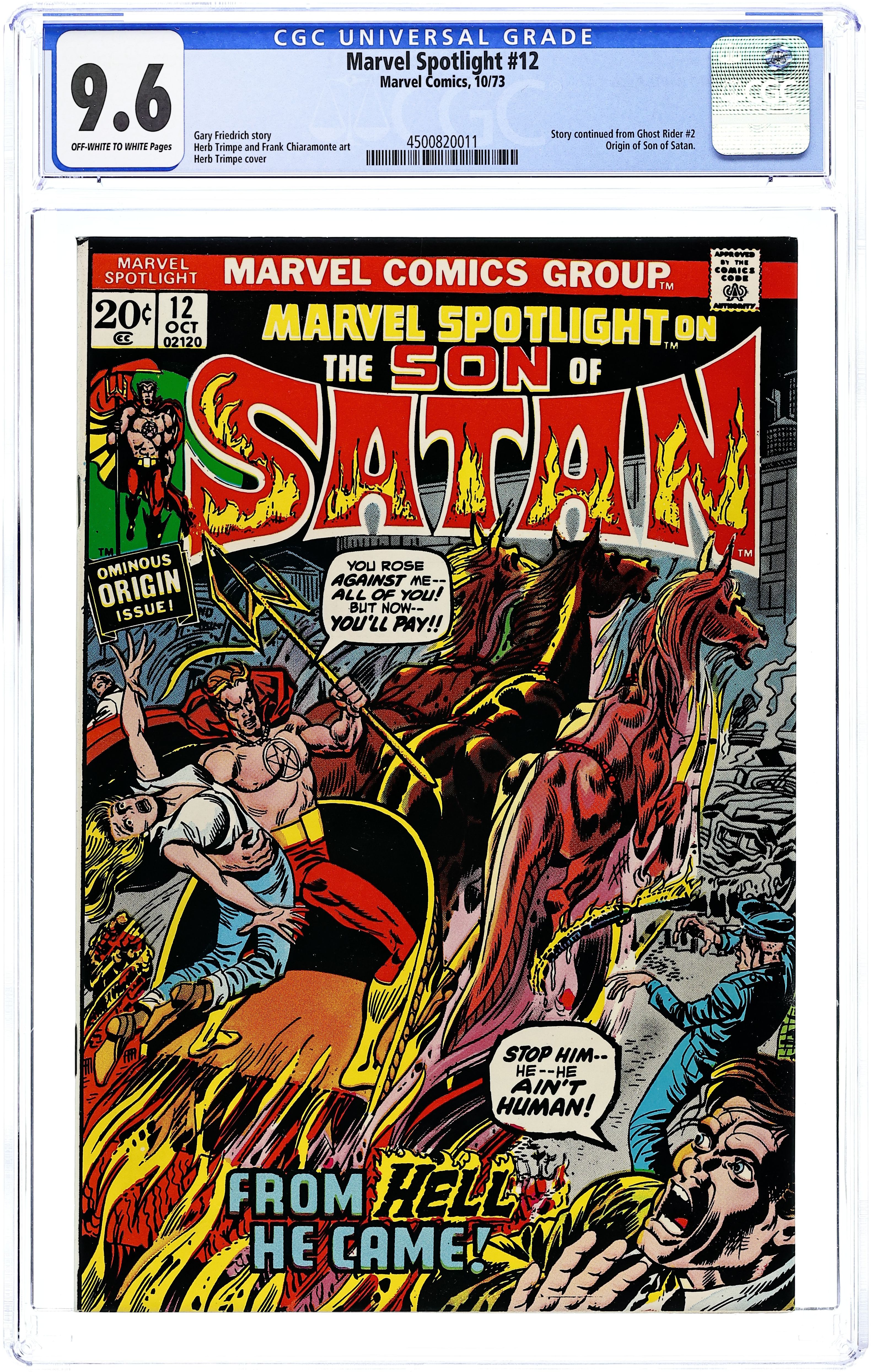 Cover pencils by Herb Trimpe. The Son of Satan, script by Gary Friedrich, pencils by Herb Trimpe, inks by Frank Chiaramonte; Sam Silvercloud and Snake free Daimon Hellstrom from his self-imposed emprisonment; Son of Satan seeks out Witch Woman and Ghost Rider and is attacked by his fathers minions; Origin and second appearance of The Son of Satan! (First appearance of Daimon Hellstrom is Ghost Rider 2.) Story continued from Ghost Rider (1973 series) #2. 36 pages, full color. Cover price $0.20.