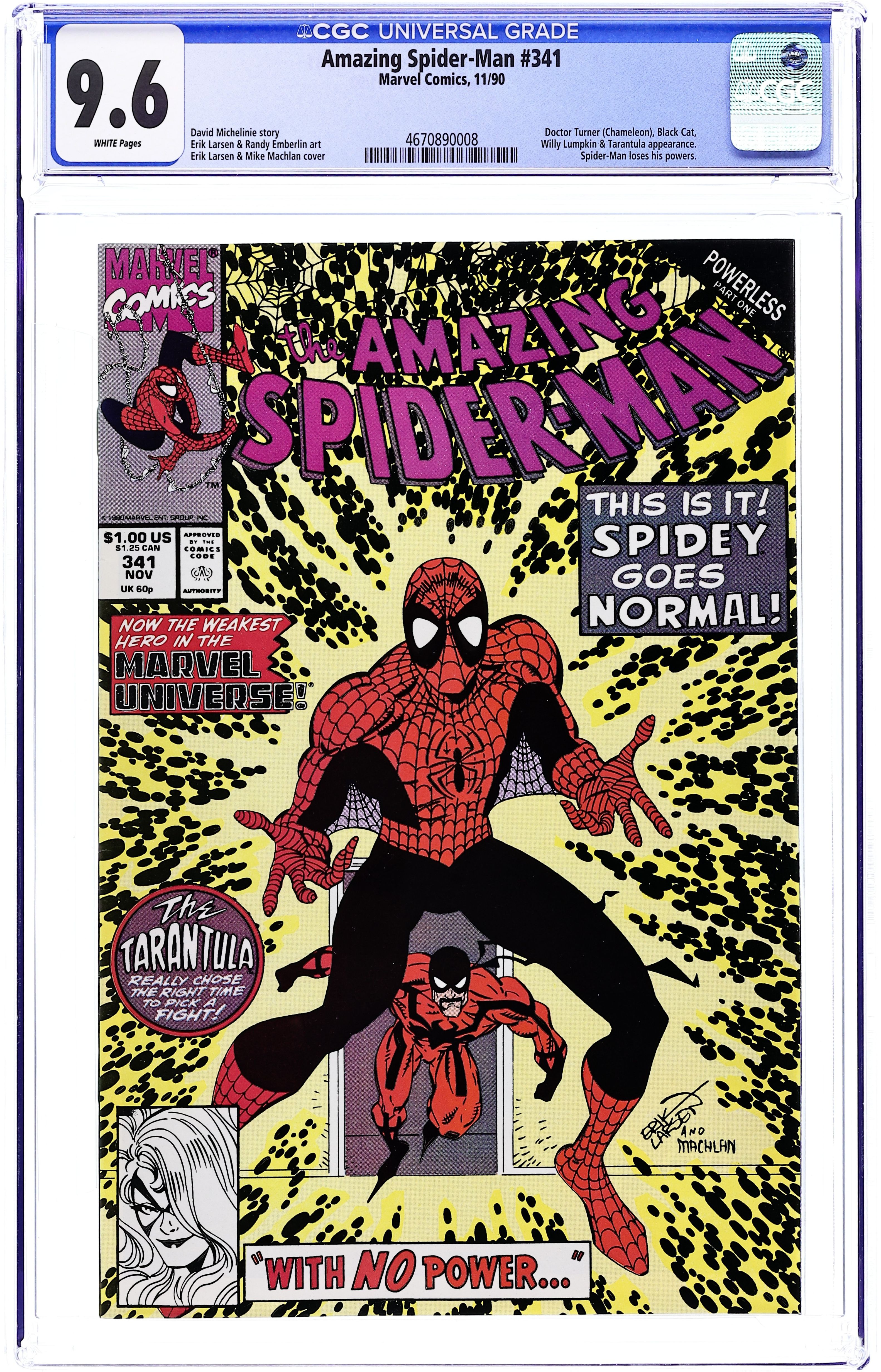 "With(out) Great Power..." Powerless Part 1 of 3. Script by David Michelinie. Pencils by Erik Larsen. Inks by Randy Emberlin. Cover by Erik Larsen and Mike Machlan. That's it! The Amazing Spider-Man's powers are gone! So what's next for Peter and Mary Jane? How about a picnic in Central Park with Flash and Felicia! Surprisingly, the couples have a great time together...until the Tarantula takes a hostage and demands an exchange for the web-slinger! So the wall-crawler (spectacular in name only now) swings into action vs. the Tarantula! Does Peter have a chance vs. the South American super-villain? Maybe so with help from Flash Thompson and the Black Cat! Cameo appearances by Aunt May, Willie Lumpkin, and the Chameleon. (Notes: The Tarantula previously appeared in Spectacular Spider-Man 138. The cover to this issue is very similar to the cover of Spectacular Spider-Man 158.) 36 pages. $1.00 cover price. Cover price $1.00.