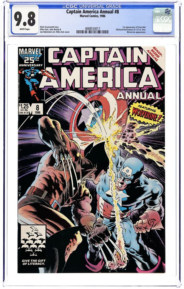 Direct Edition. "TESS-One" Guest-starring Wolverine. Script by Mark Gruenwald. Pencils by Mike Zeck. Inks by John Beatty and Joe Rubinstein. Cover by Mike Zeck and John Beatty. Captain America and Wolverine face off against a super-soldier killing robot in an attempt to avert a nuclear disaster! First appearance of TESS-One. Appearance by Bob Frank Jr. (aka Nuklo, son of the golden age Whizzer). Flashback cameo by President Franklin Delano Roosevelt. (Notes: TESS-One returns in Avengers 288. Overrider appears again in Nick Fury Agent of SHIELD (3rd series) 33. The plot in this annual resembles the story in Avengers Annual 9.) 52 pgs., $1.25 Cover price $1.25.
