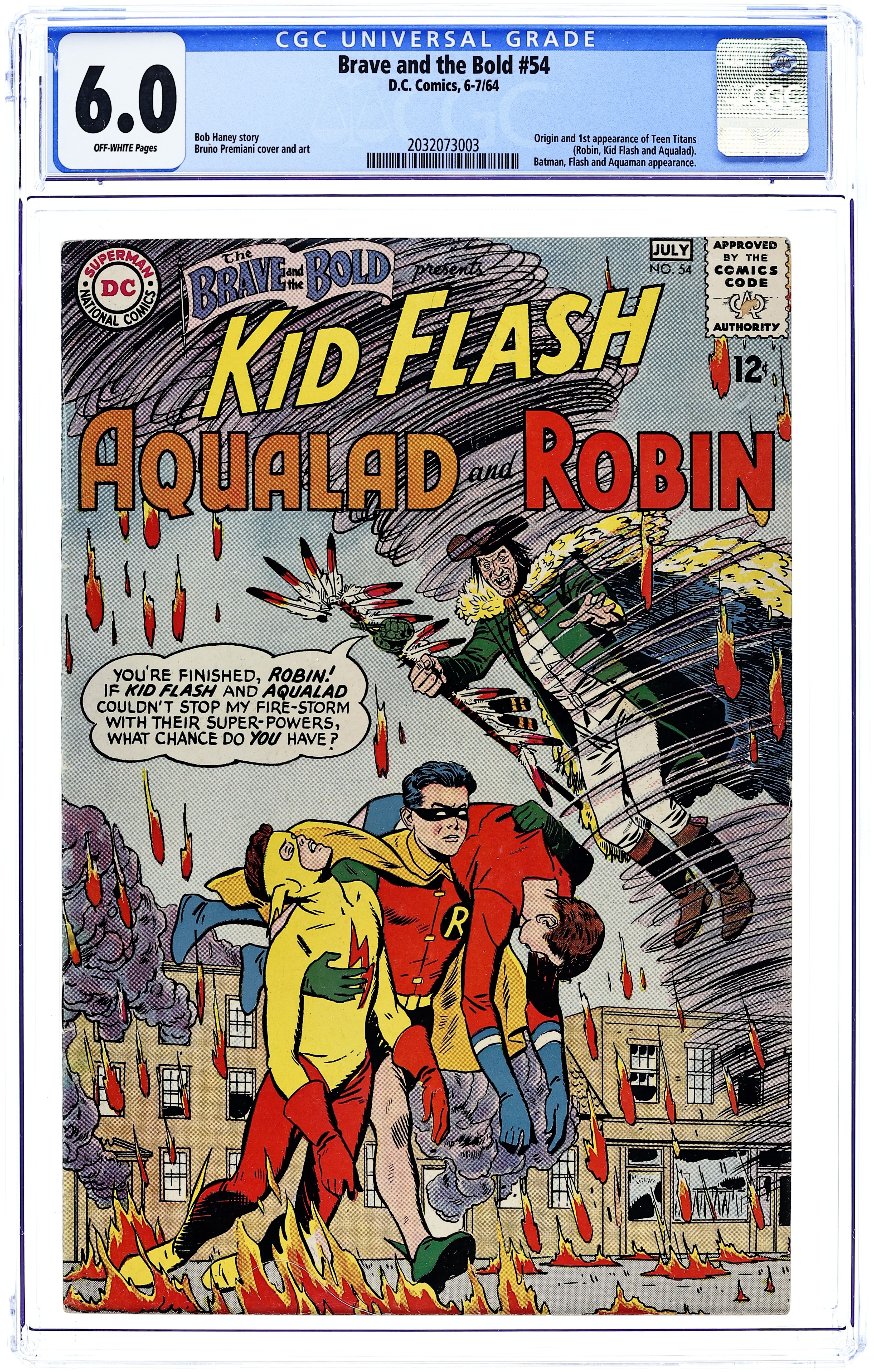 Cover by Bruno Premiani. 1st appearance and origin of the Teen Titans (Robin, Kid Flash, Aqualad) in "The Thousand-and-One Dooms of Mr. Twister," script by Bob Haney, art by Bruno Premiani; The townsfolk of Hatton Corners is in the midst of a dispute; The adults of the neighborhood feel that the teen populace are too wild and unruly, whereas the teens feel that the adults are too "un-hip" and incapable of relating to teenage problems; Ironically, the teen youth movement is led by Eddie Corliss, son of the town's mayor; Eddie organizes a club house meeting and invites three famous teen super-heroes to come to Hatton Corners to support their cause; They invite Aqualad, Kid Flash and Robin; Before the heroes arrive however, a crazed super-villain known as Mister Twister blusters through town riding atop a giant cyclone. Cap's Hobby Center by Henry Boltinoff. 36 Pages, Full Color. Cover price $0.12.