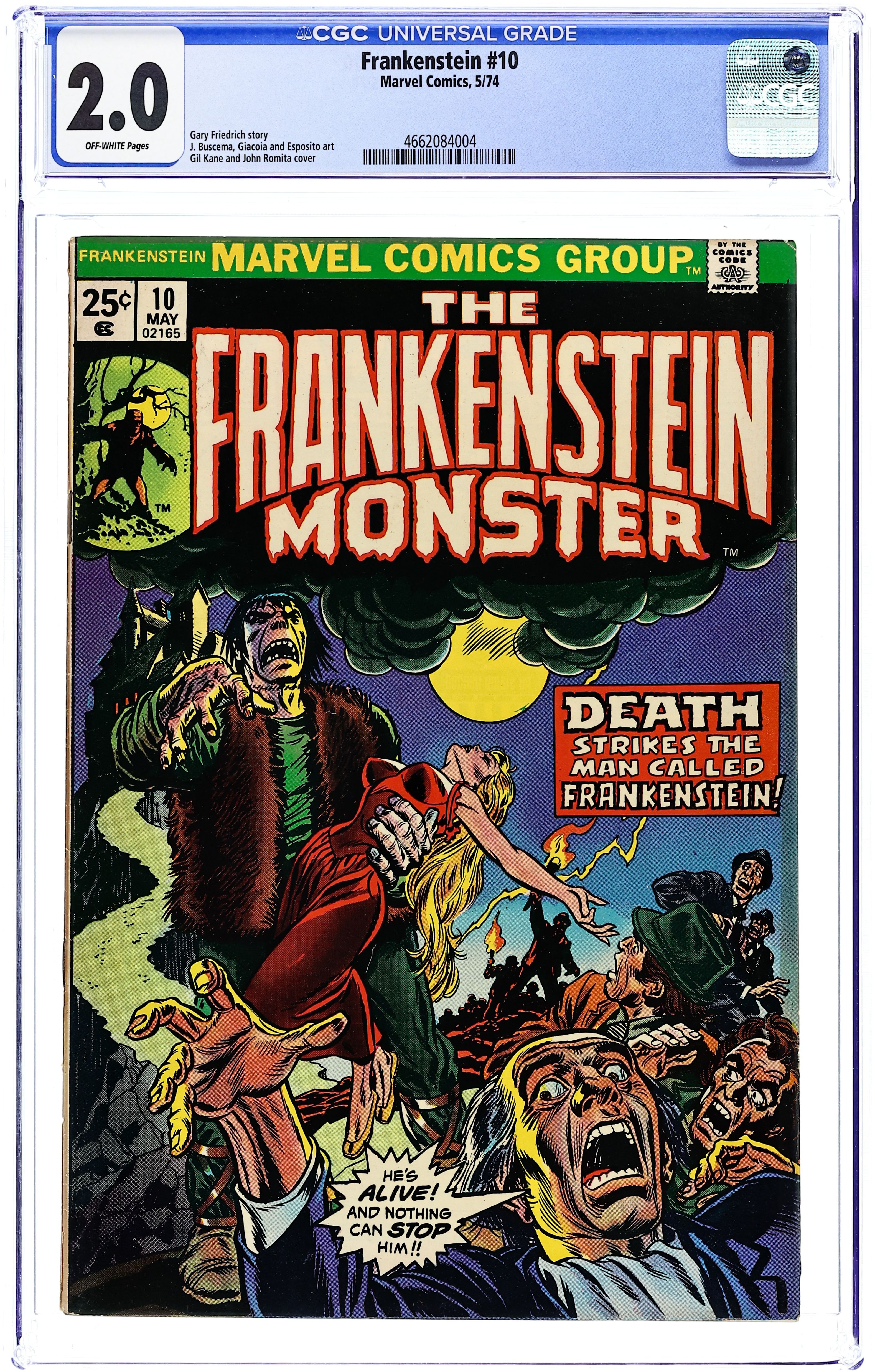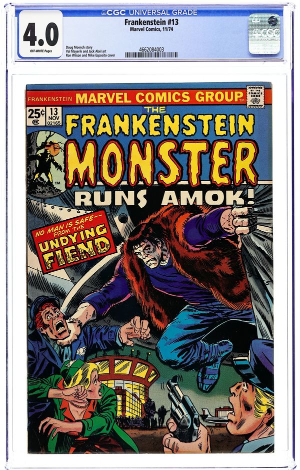Marvel begins its own unique take on the Frankenstein mythos by, in essence, continuing the Mary Shelley story--beginning with the discovery of the monster frozen in ice and bringing it back to life! "Mary Shelley's Frankenstein!" Script by Gary Friedrich, early classic art and cover by Mike Ploog. Cover price $0.20.