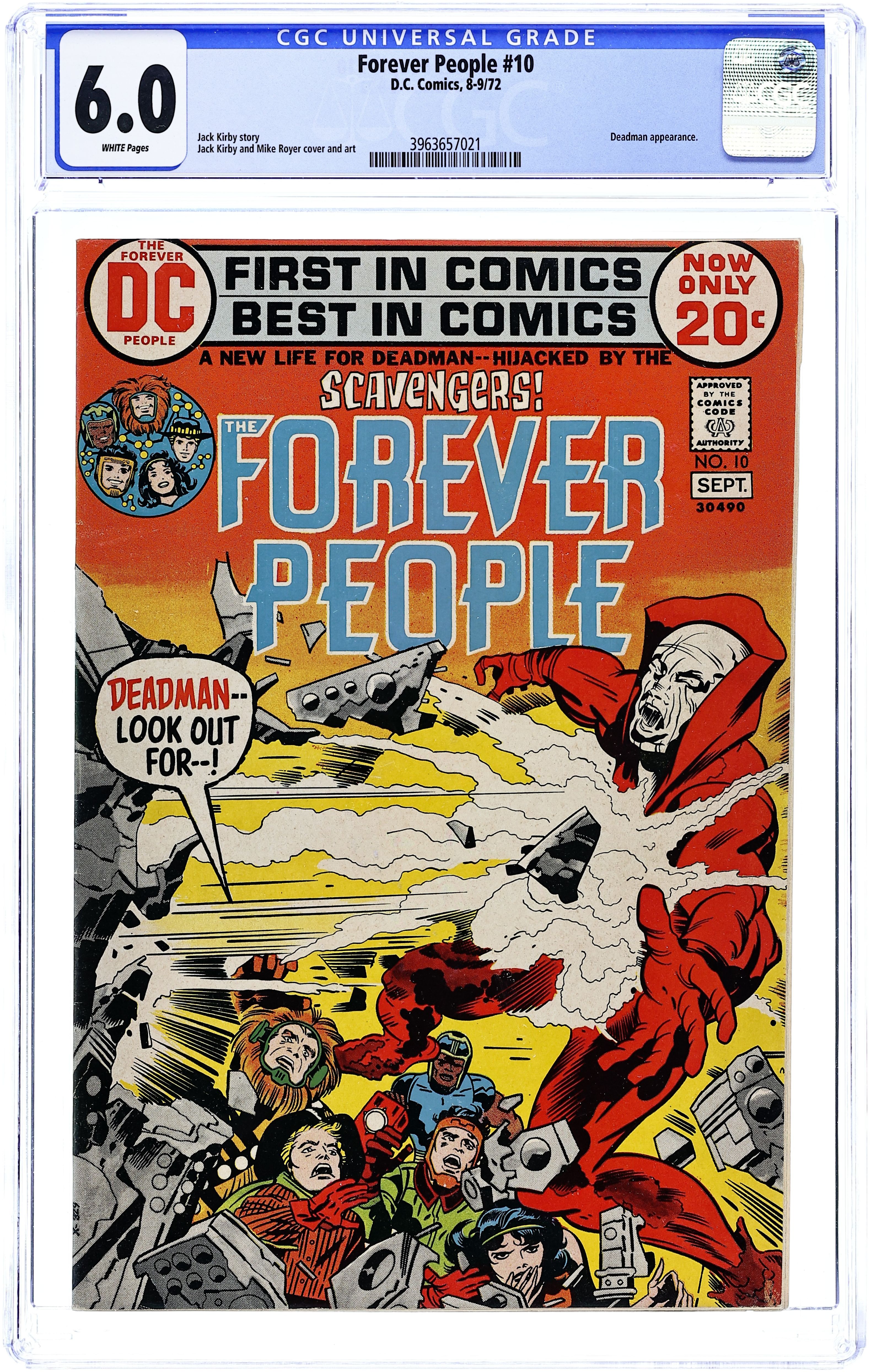 Cover pencils by Jack Kirby, inks by Mike Royer. The Scavengers, script and pencils by Jack Kirby, inks by Mike Royer; The Forever People build Deadman a body so he can interact with the physical world; Deadman learns that he has not yet found his killer; Deadman and the Forever People track down the Scavengers. 32 pgs. $0.20. Cover price $0.20.