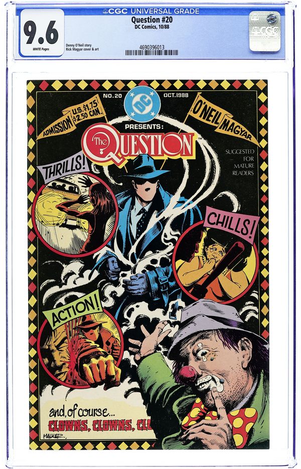 The circus is in town, but something going on at this sleazy traveling show has got the Question very interested. And Myra is up to her neck in a circus of her own...Hub City's politics. Written by Dennis O'Neil, with art by Rick Magyar. Cover by Magyar. Suggested for Mature Readers. Deluxe format. Cover price $1.75.