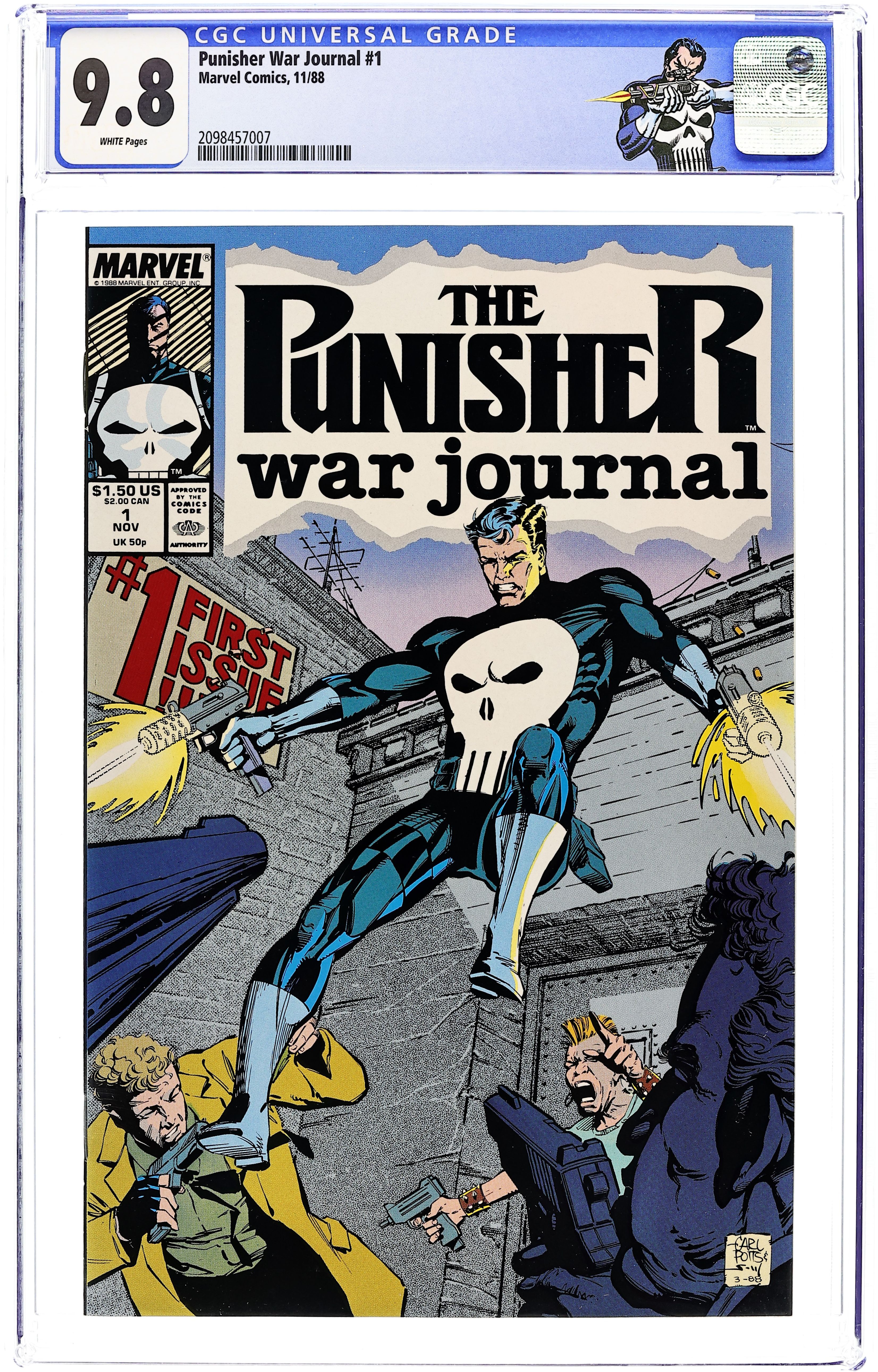 Newsstand Edition. Cover art by Carl Potts and Scott Williams. An Eye for an Eye Chapter One Sunday in the Park, script by Carl Potts, pencils by Carl Potts and Jim Lee, inks by Jim Lee; Punisher shoots some criminals and recalls his family's death in Central Park. Profiles of this issue's creators. 36 pgs. $1.50. Cover price $1.50.