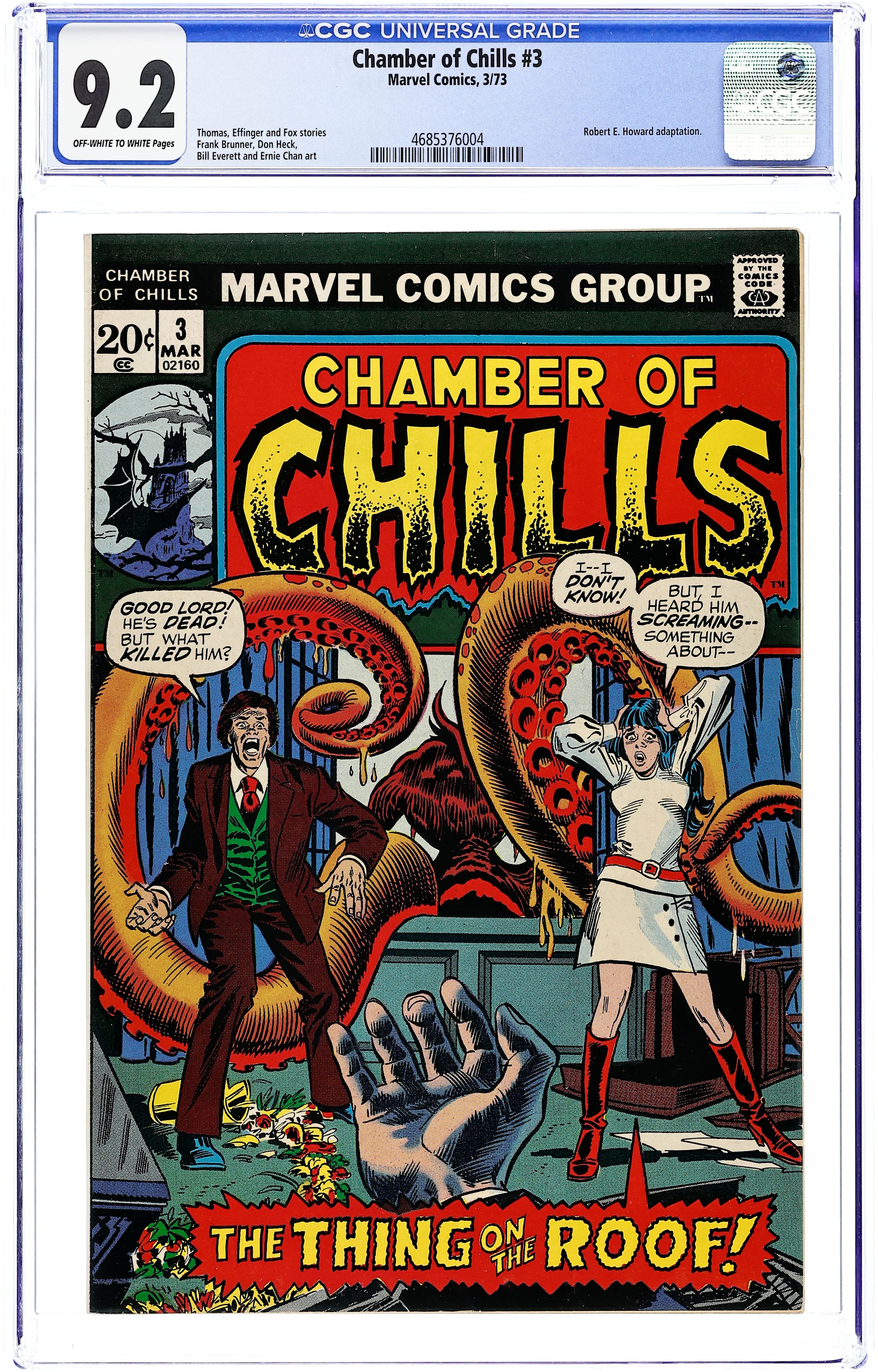 Cover pencils by Alan Weiss, inks by Frank Giacoia. All new stories: The Thing on the Roof!, script by Roy Thomas, art by Frank Brunner; A search for a treasure in Central America unleashes a terrible creature that pursues the treasure-hunter to his doom; adapting the story by Robert E. Howard. All the Shapes of Fear!, script by George Alec Effinger, pencils by Don Heck, inks by Bill Everett; A motorcyclist accidentally runs over a child, in spite of an attempt by his future self to warn of the danger. The Girl Who Cast No Shadow, script by Gardner Fox, art by Ernie Chan (as Ernie Chua); A journalist is lured to his death by a woman who seems to need his help, but who is actually enslaved to an ancient demon. 36 pgs., full color. $0.20. Cover price $0.20.