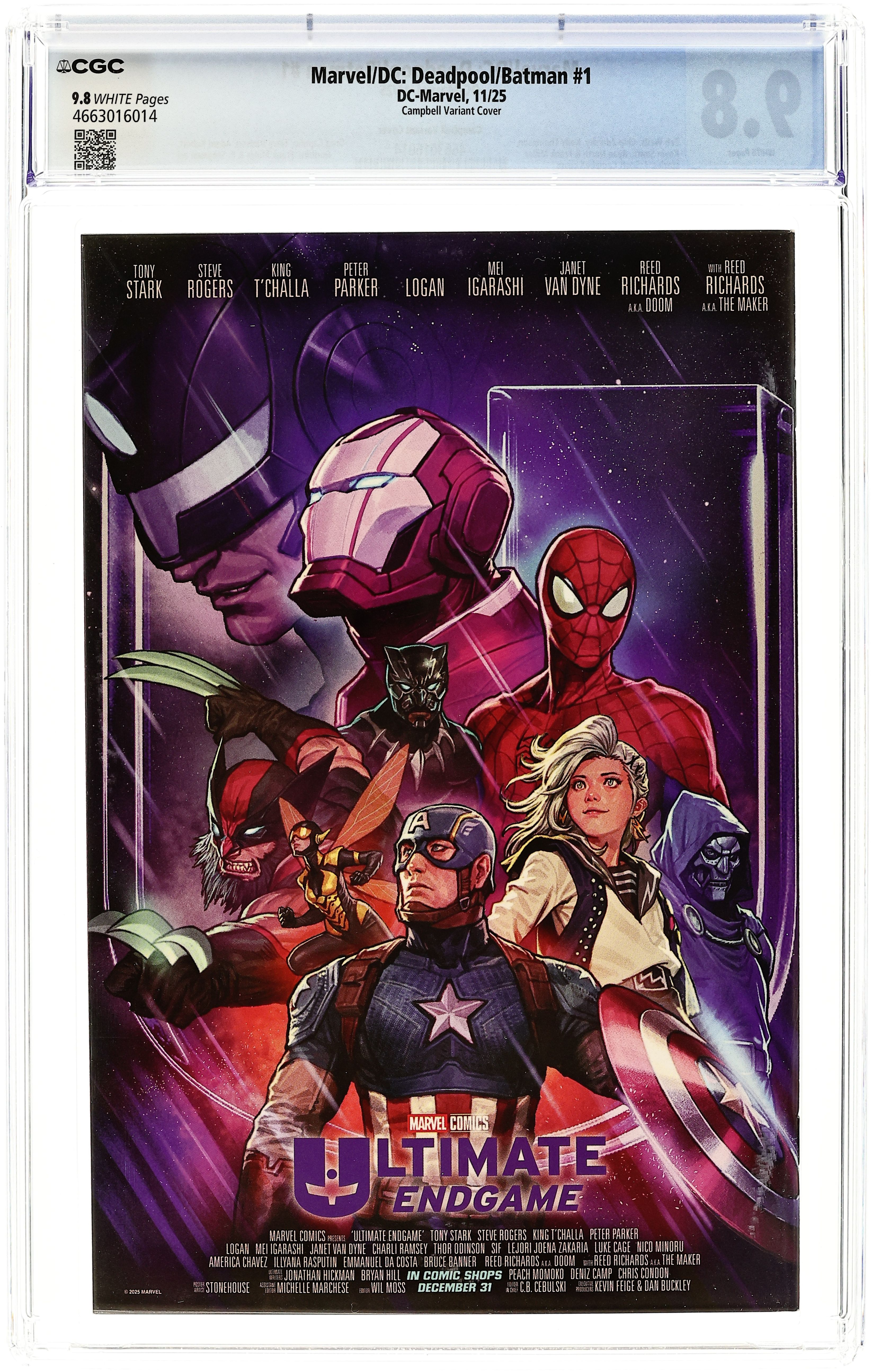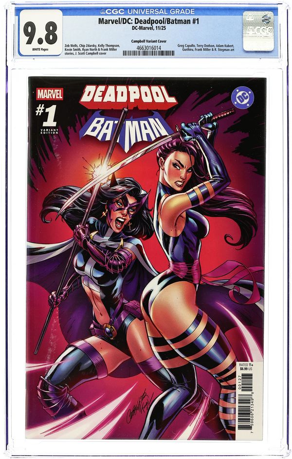 Written by Zeb Wells, Chip Zdarsky, Kelly Thompson, Kevin Smith, Al Ewing, Frank Miller, Ryan North. Art by Greg Capullo, Terry Dodson, Gurihiru, Adam Kubert, Dike Ruan, Frank Miller, Ryan Stegman. Cover by Peach Momoko. The crossover you've pined for but never thought possible: DEADPOOL and BATMAN cross swords and batarangs as MARVEL and DC unite for the first time in decades! WADE WILSON has been hired for a job in GOTHAM CITY, but will the WORLD'S GREATEST DETECTIVE help him or destroy him? The one-shot will also feature additional backup stories spotlighting other exciting Marvel and DC team-ups from a lineup of all-star talent, including Daredevil and GREEN ARROW by Kevin Smith and Adam Kubert, Captain America and Wonder Woman by Chip Zdarsky and Terry Dodson, and Jeff the Land Shark and Krypto by Kelly Thompson and Gurihiru. 64 pages, full color, Rated T+ Cover price $6.99.