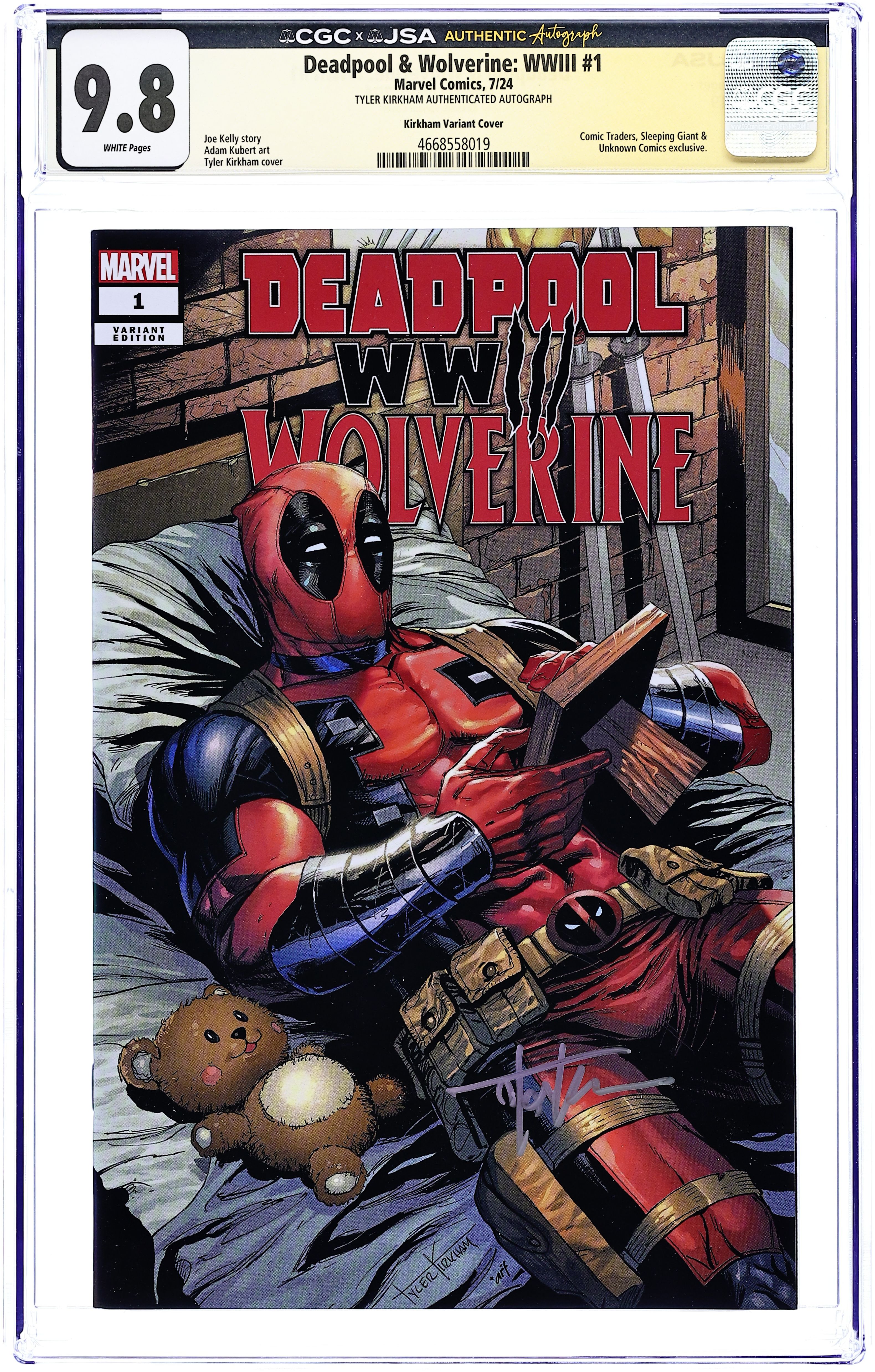 Comics Illuminati (Unknown Comics, Comic Traders, and Sleeping Giant) Exclusive Variant Cover by Tyler Kirkham. Written by Joe Kelly. Art by Adam Kubert. WADE AND LOGAN'S ALL-OUT WAR CONCLUDES! WWIII has emerged. WOLVERINE is tested beyond his limits. DEADPOOL is…no more?! Discover how this drastic showdown figures into the DELTA's plans. And with THOSE WHO WATCH counting on unending bloodshed, whose will be the last blood to spill? The epic finale to the Deadpool and Wolverine doubleheader that'll be the talk of the summer! 40 pages, full color.